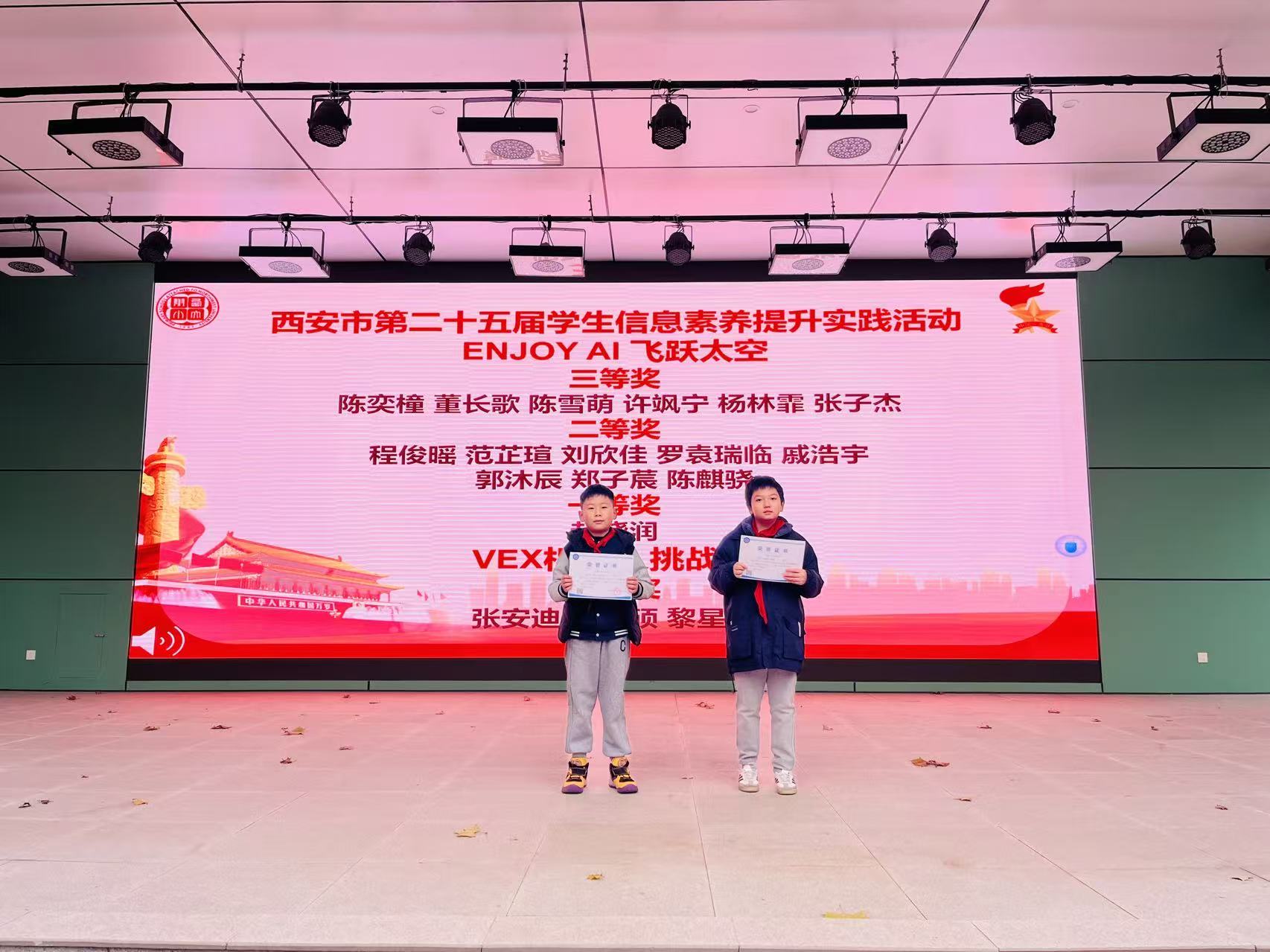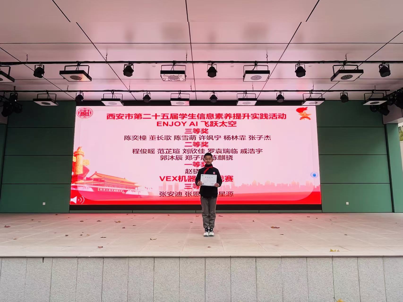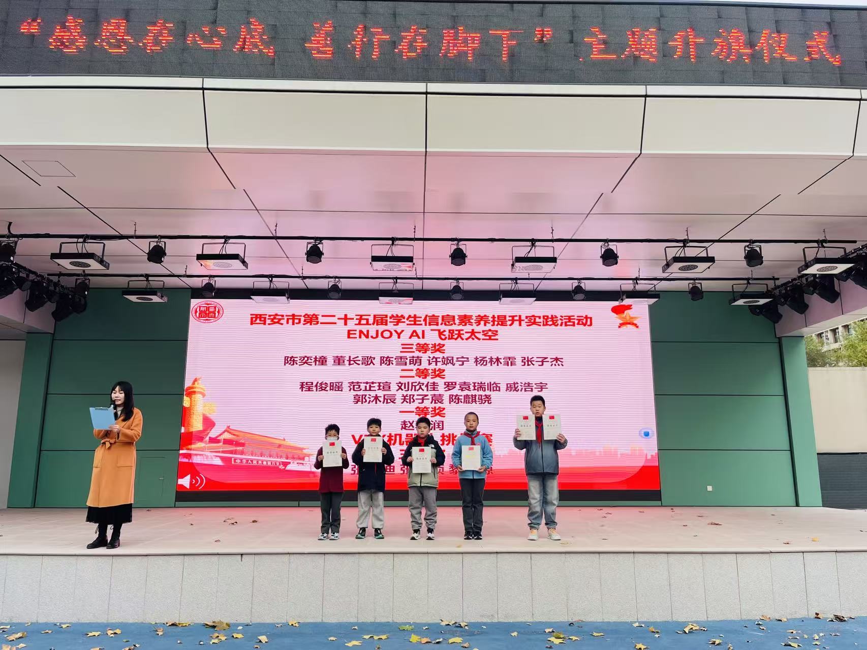 11月24日早晨升旗仪式结束后,学校特举行竞赛获奖学生专项颁奖仪式。颁奖现场,课程中心主任蒋海丽首先详细回顾学生参赛亮点:在陕西省青少年航空航天模型教育竞赛中,学生们凭借精准的模型操控技巧与富有创意的设计方案,充分展现对航空航天领域的热爱与钻研精神;参与西安市学生信息素养提升实践活动时,同学们围绕数字创作、智能应用等主题完成作品,凸显扎实的信息科技素养与实践能力;在VEX机器人挑战赛里,参赛团队分工协作、默契配合,通过编程调试与机械搭建,高效完成机器人任务执行,彰显团队协作力与创新思维。