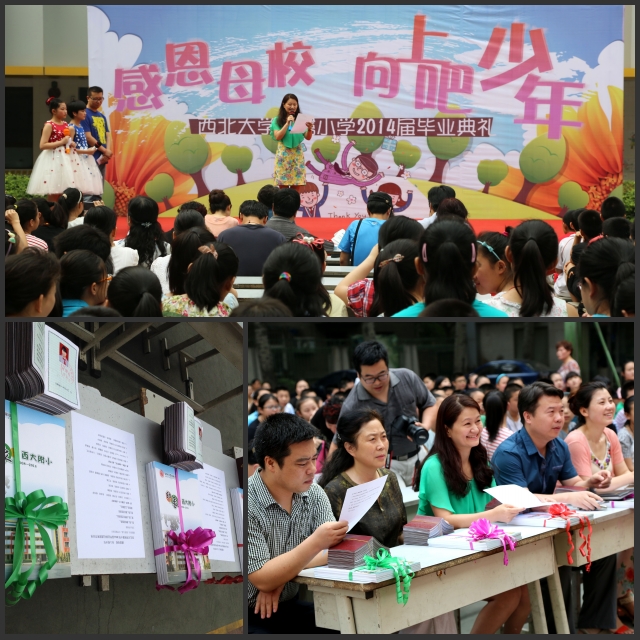 2014年七月一日的上午,2014届毕业典礼在西大附小操场隆重召开。这是六年级孩子们人生道路成长中最重要的一天。为了能够让六年的小学生活划上一个圆满的句号,毕业考试结束后,六年级组的各位老师不辞辛苦带领演出的同学们积极排演节目,为大家送上了一台节日的盛宴。