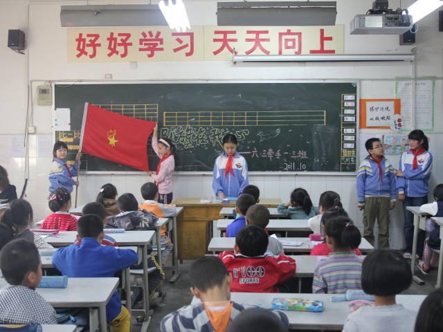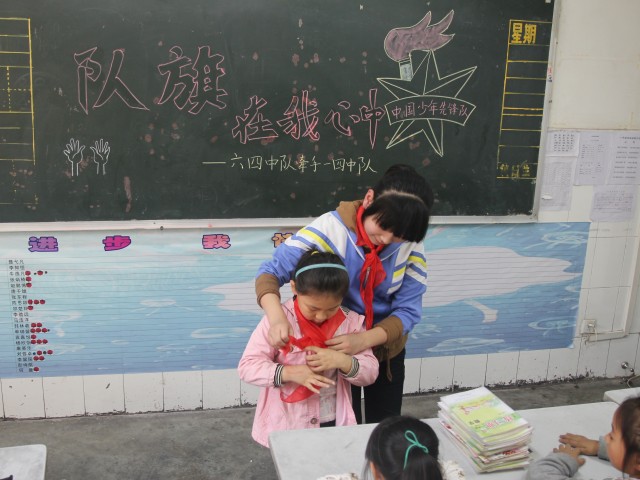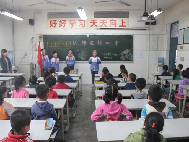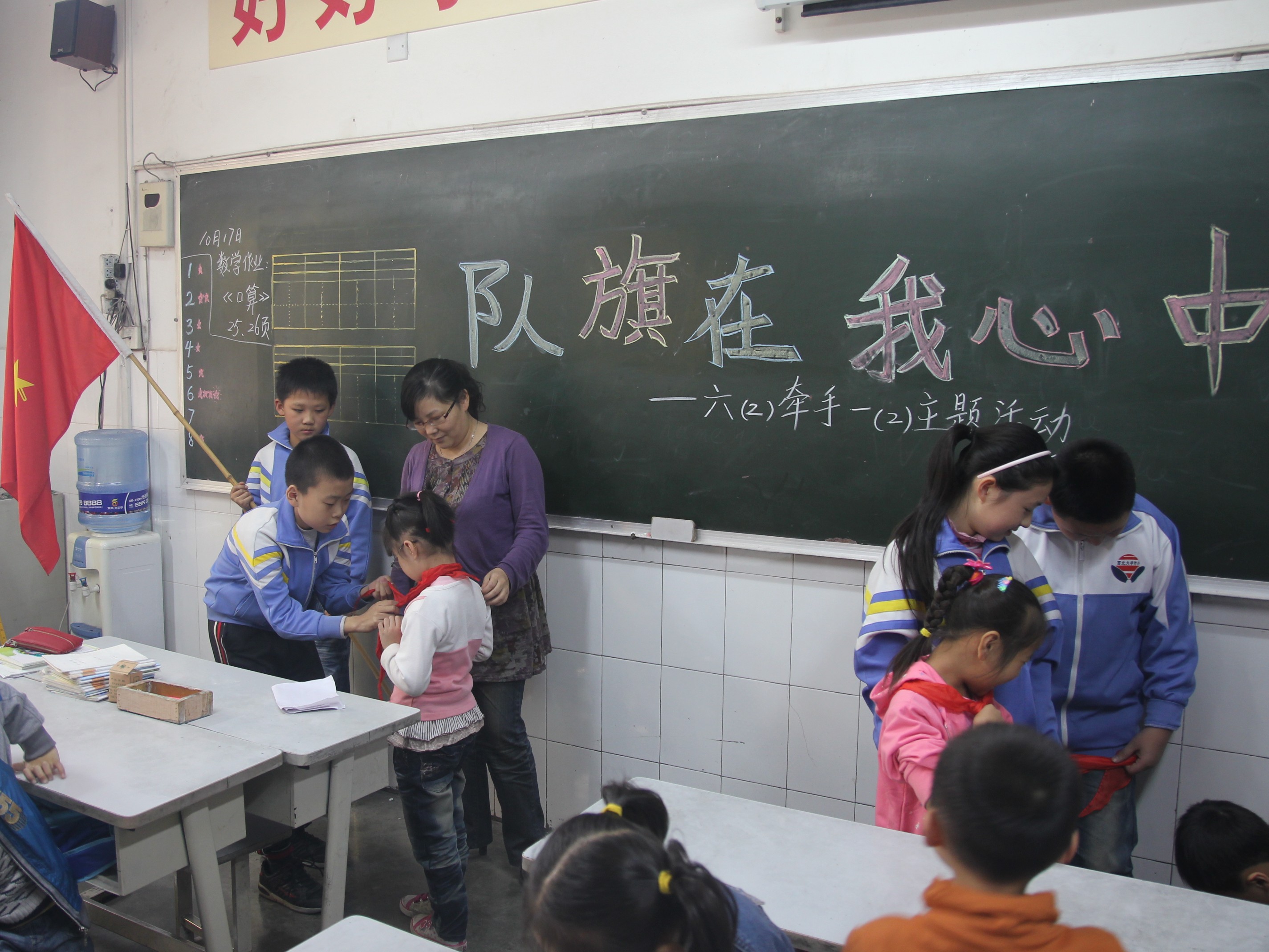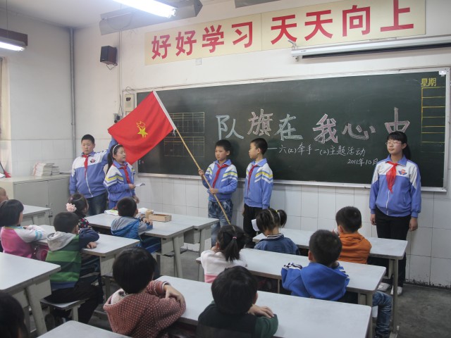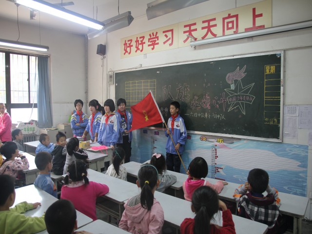 在中国少年先锋队建队62周年之际,星期一班会课时间,我校六年级各班牵手一年级,组织了“队旗在我心中”主题班会。六年级的大哥哥大姐姐当起了少先队小讲师,讲解队旗的寓意,少先队的标志,给他们带来许多少先队的知识。