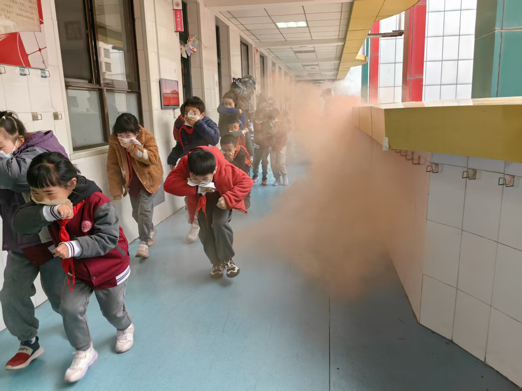 11月10日16:15,校园广播发紧急通知,消防警报响起,情景化消防疏散演练开始。班主任组织学生用毛巾捂口鼻、弯腰俯身沿预设路线撤离,疏散引导组老师指引方向、制止危险行为,广播同步传报警及逃生示范内容,操场旁传来消防车模拟声响,两位老师现场演示了火盆灭火。四年级小小消防宣讲员讲解秋冬季安全用火用电注意事项。校务及保障中心副主任黄燕在演练总结中肯定了本次演练的高效性,同时指出不足,强调要把演练当实战,才能在真正危险来临时保护自己。