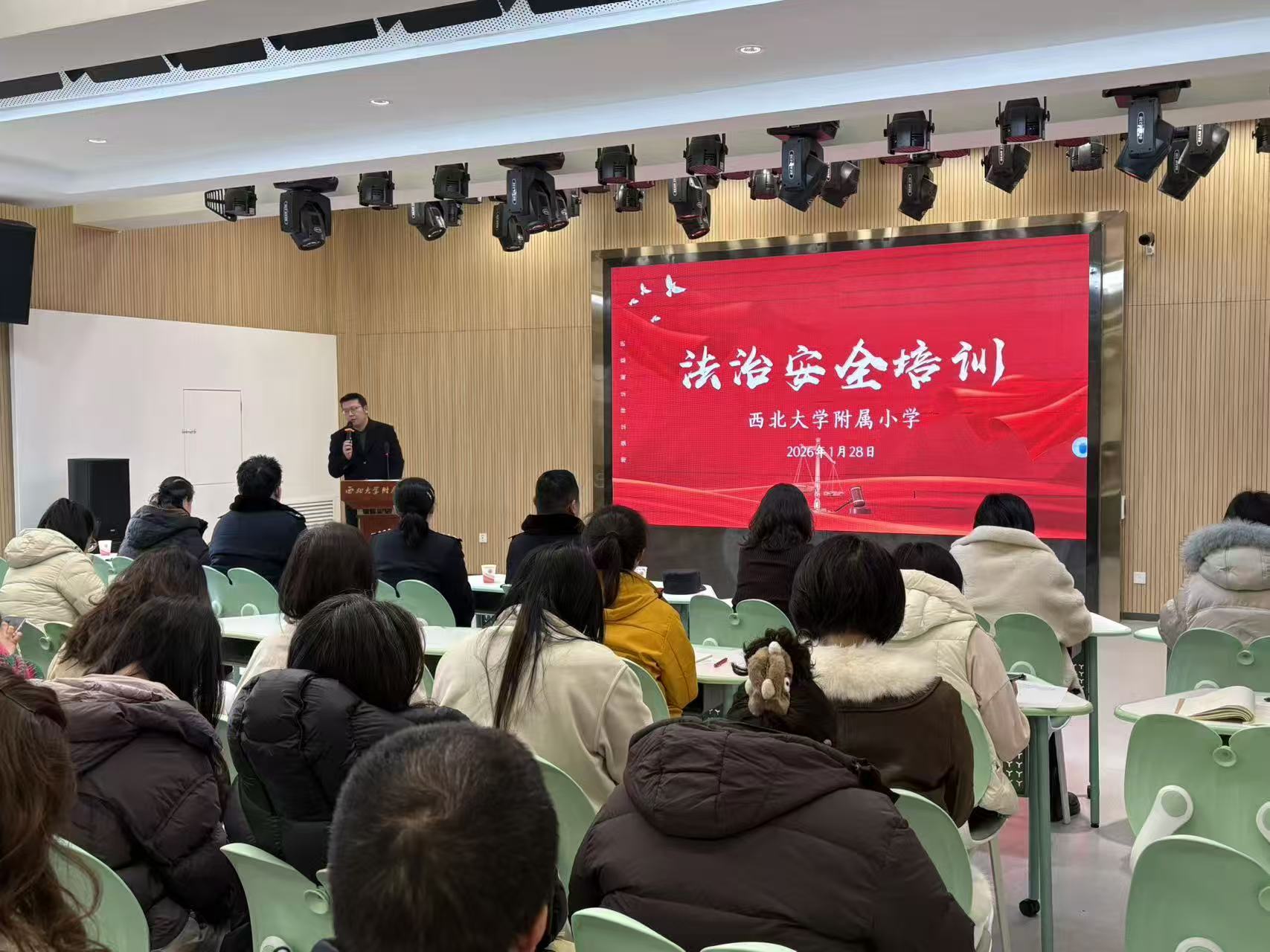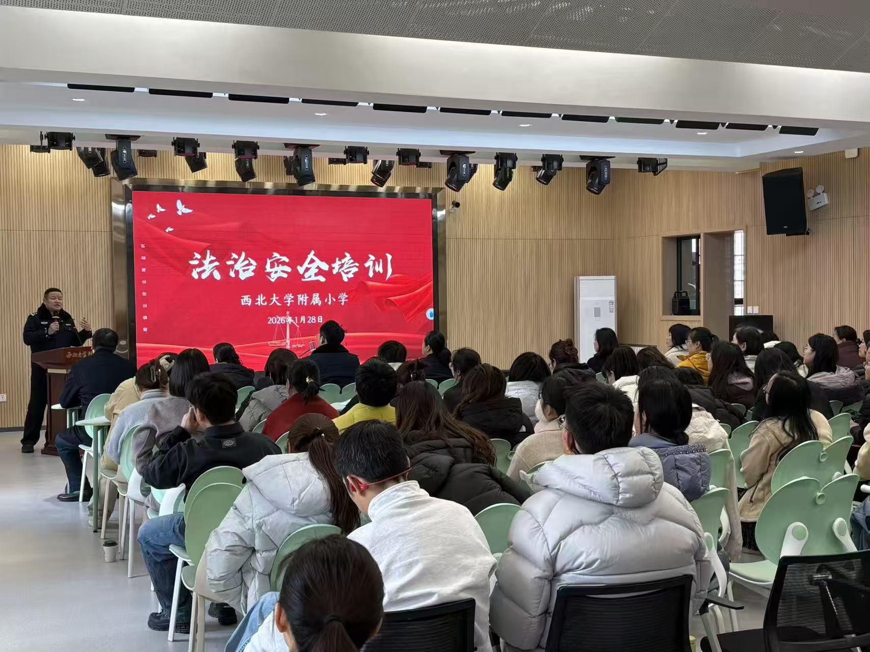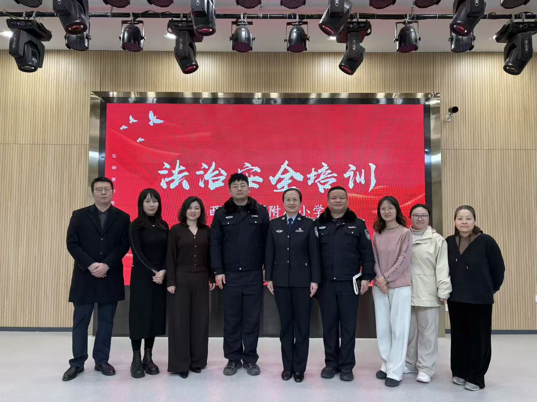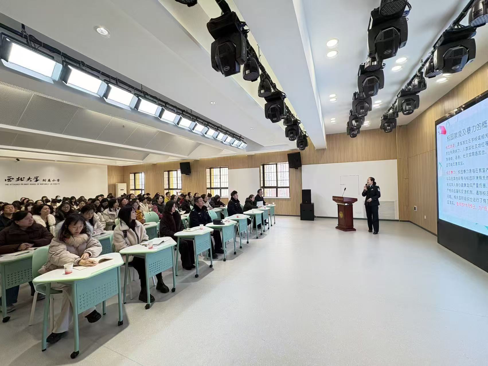 为强化教师法治素养,提升依法执教与校园安全管理能力,筑牢校园安全防线,1月28日下午,我校特邀碑林分局政保大队吕欣警官、太白路派出所四级高级警长兼学校法治副校长李明警官及太白路派出所屈震警官,向全校教师开展法律法规培训。西大附小执行校长马红娟与会。