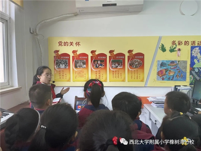 高年级队员和一年级小伙伴,开展了“手拉手,我们一起心向党”队前教育主题活动,大哥哥大姐姐用生动形象的解说,给预备队员们介绍了队旗、队徽、红领巾的来历等有关少先队的知识。
