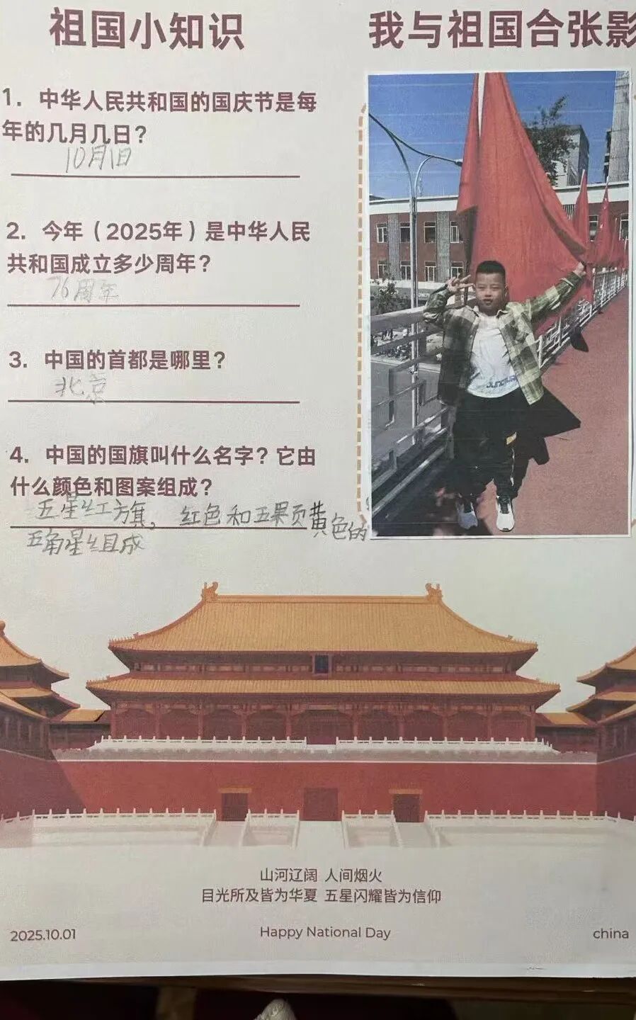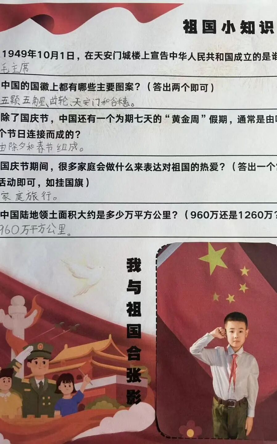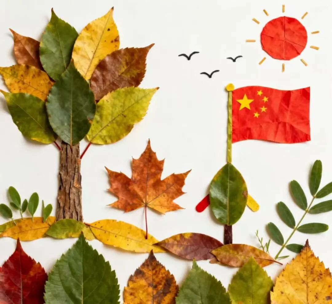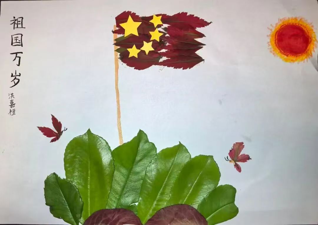 捡拾秋日脉络分明的落叶,拼贴出五角星与红旗的模样。自然之美与爱国之情交融,学生在动手间读懂国旗的意义,让热爱有了可触可感的温度。