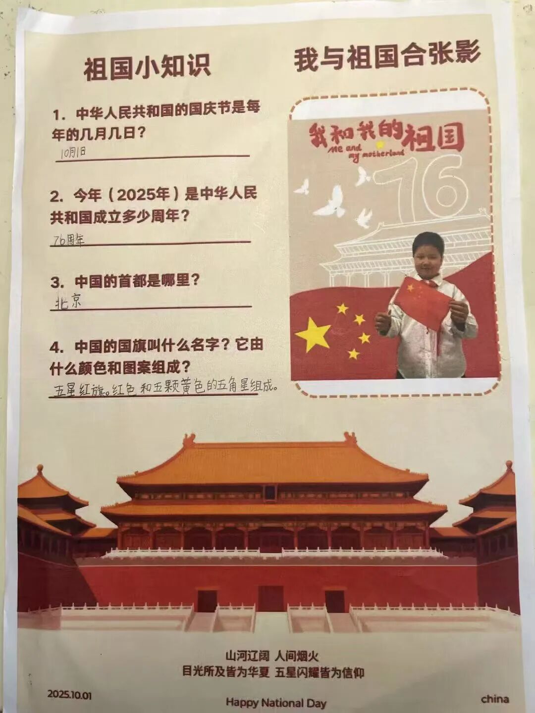 双节实践的时光虽短,却在学子心中种下了家国与文化的种子。它不仅是一次动手体验,更是一堂浸润心灵的成长课,助力学生在实践中知国情、传文化,成长为有情怀、有担当的新时代少年。