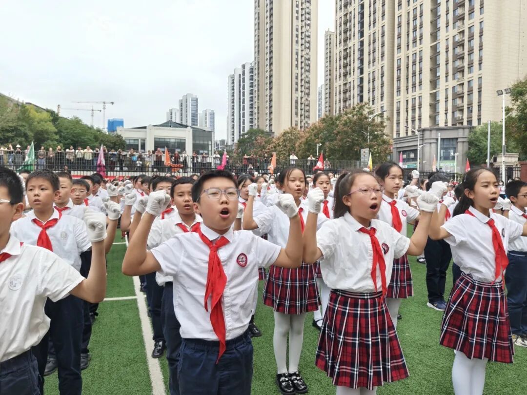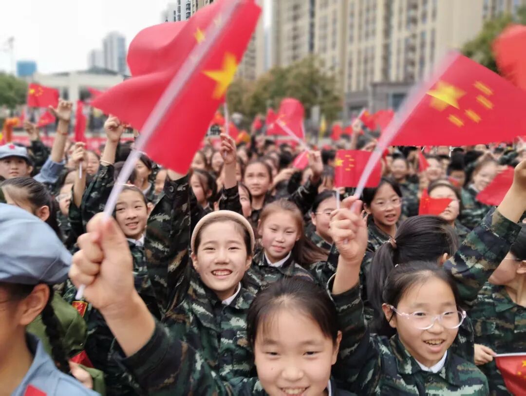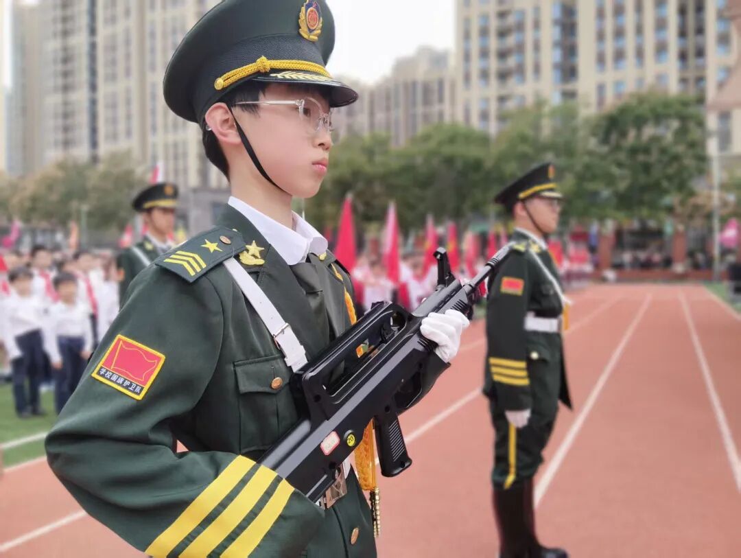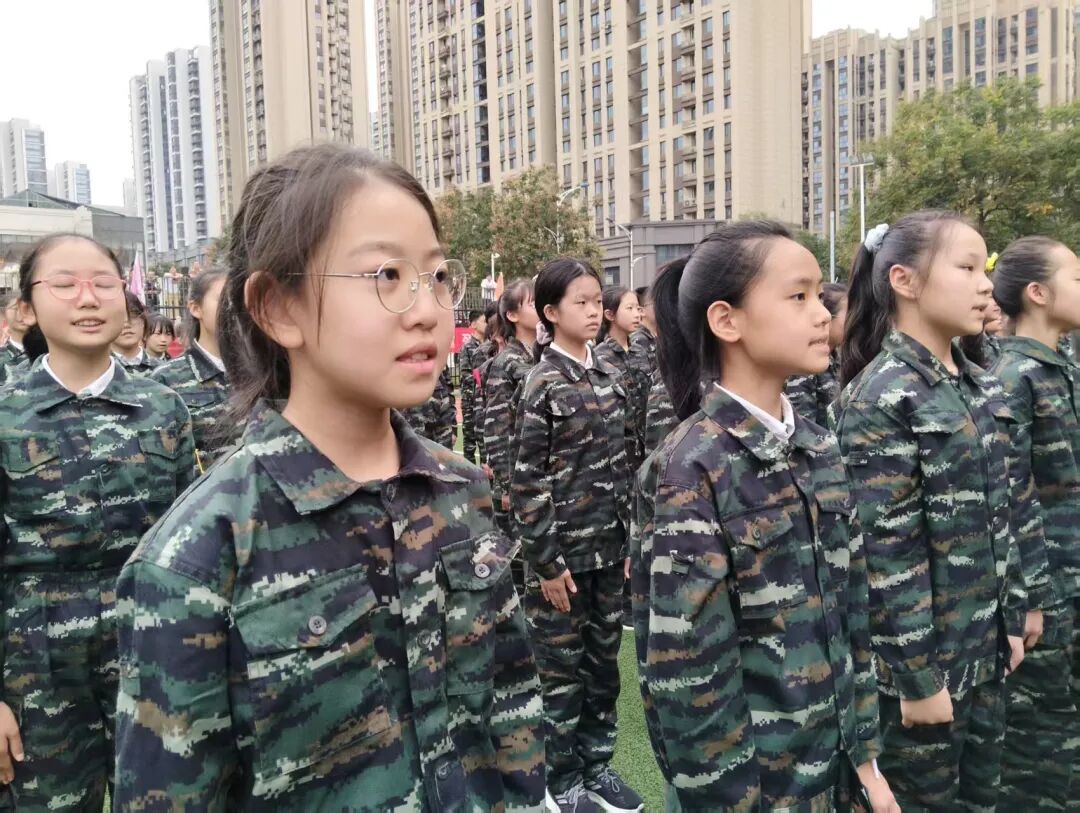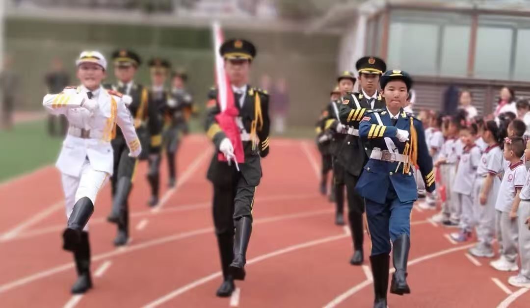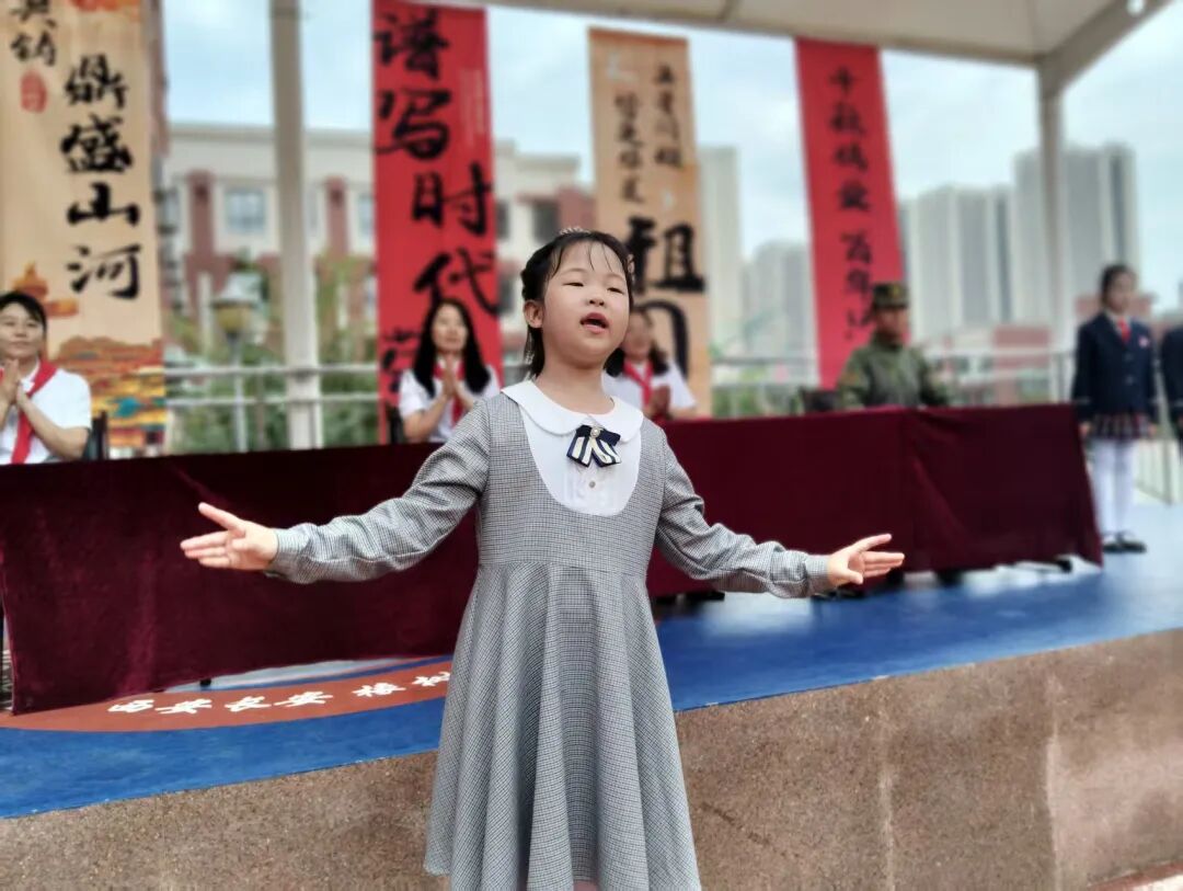 三年级学子先以整齐队列亮相,抬手、迈步动作划一,转体时,队列如刀切般齐整。随后《强军战歌》响彻全场,孩子们眼神坚定、歌声铿锵,曲终齐声喊“胜利”、高举拳头,稚嫩模样满是热血。