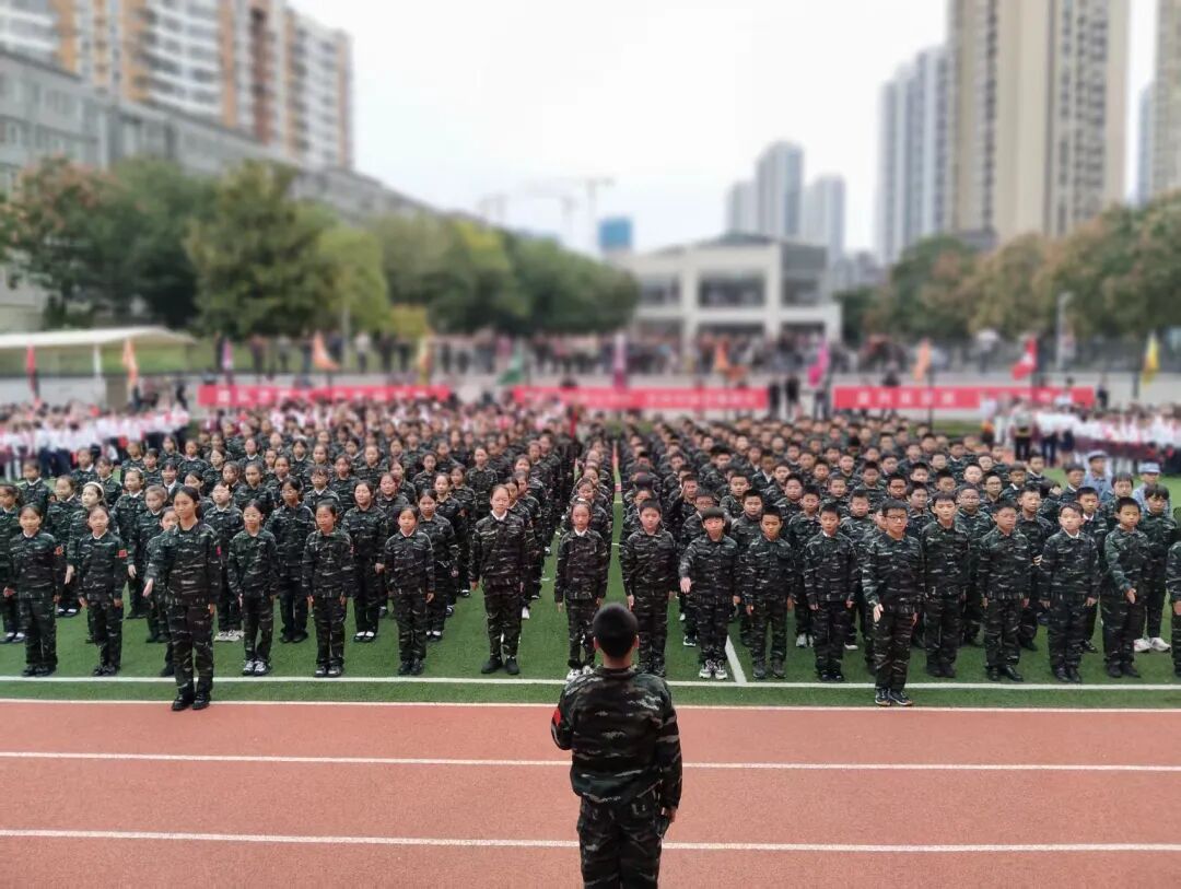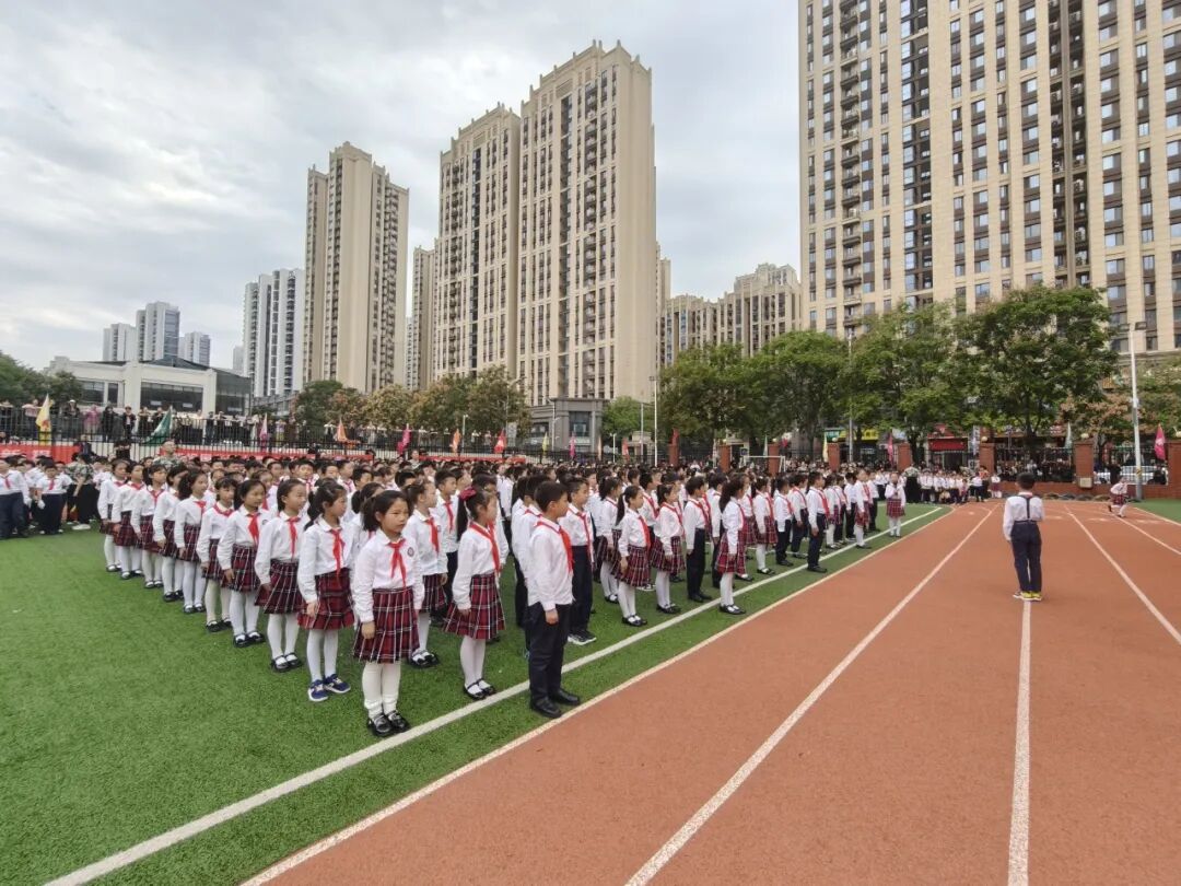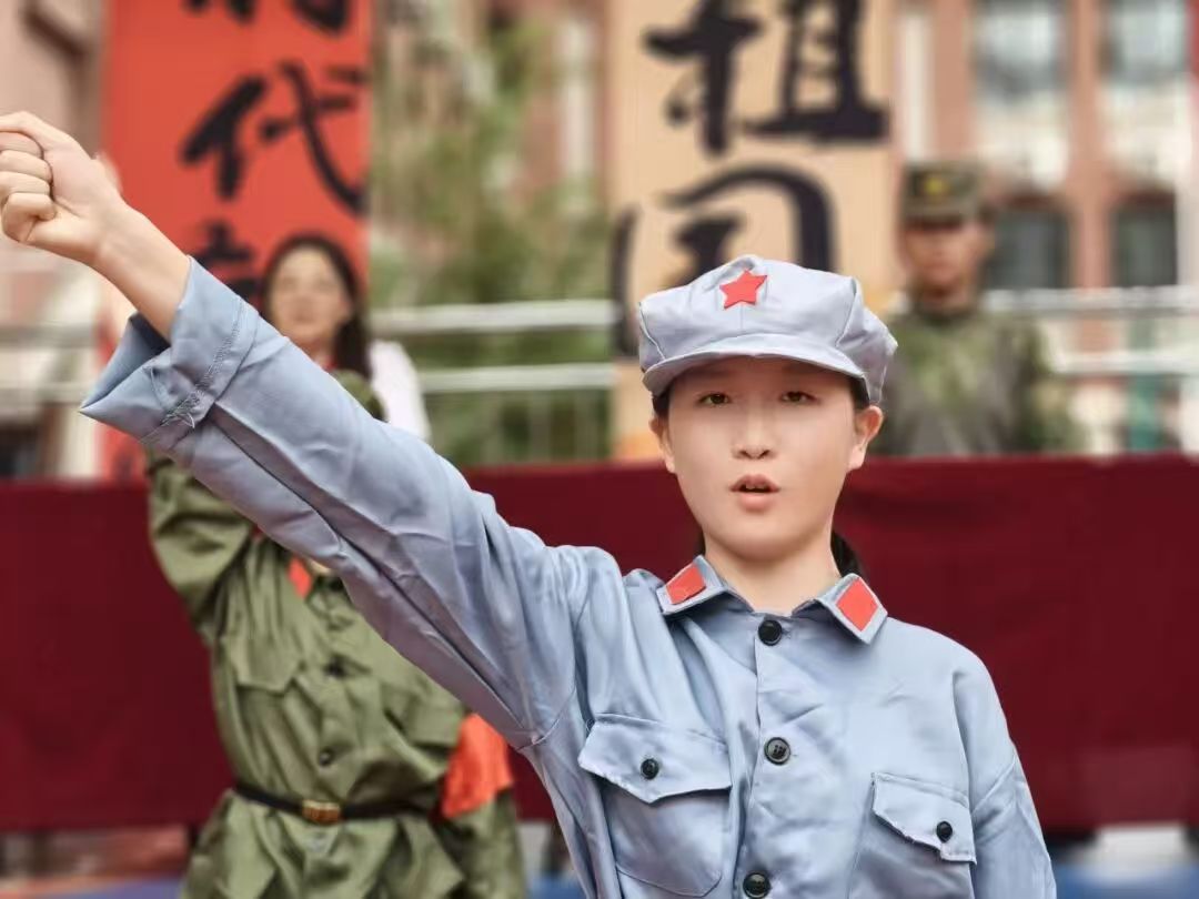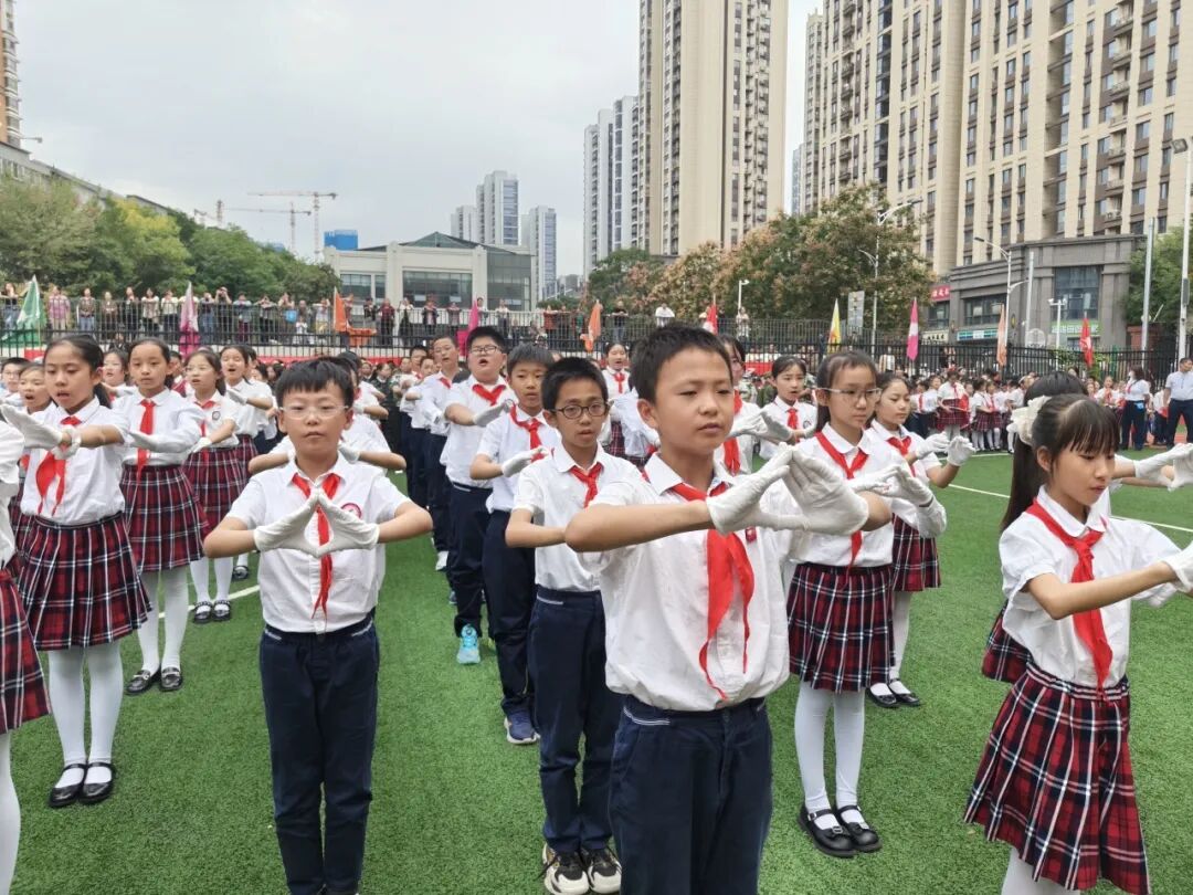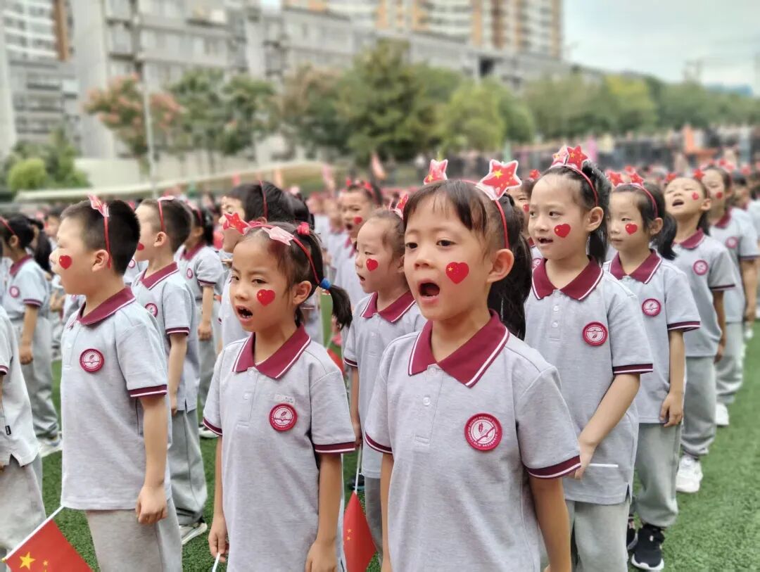 三年级学子先以整齐队列亮相,抬手、迈步动作划一,转体时,队列如刀切般齐整。随后《强军战歌》响彻全场,孩子们眼神坚定、歌声铿锵,曲终齐声喊“胜利”、高举拳头,稚嫩模样满是热血。