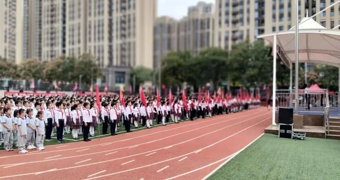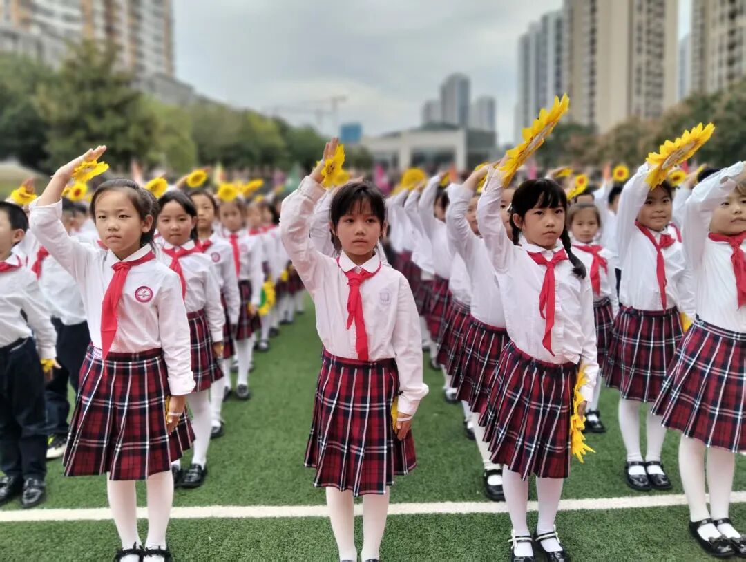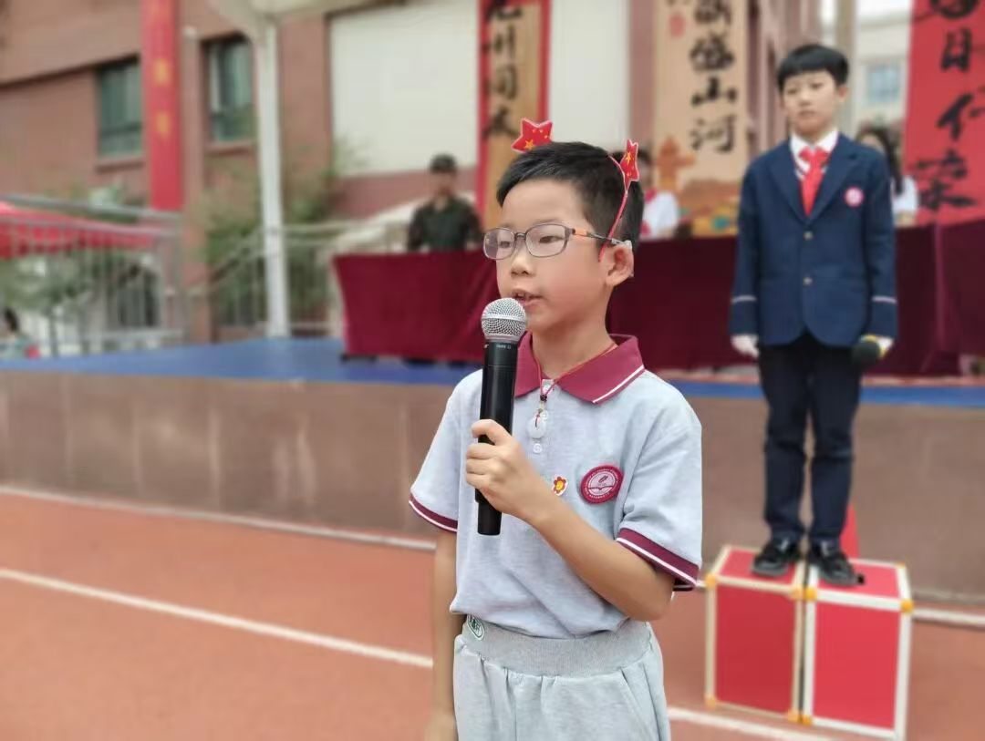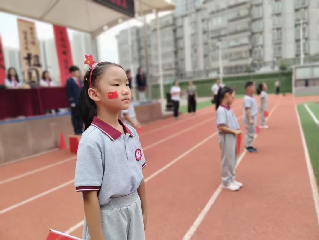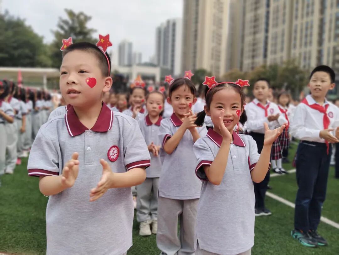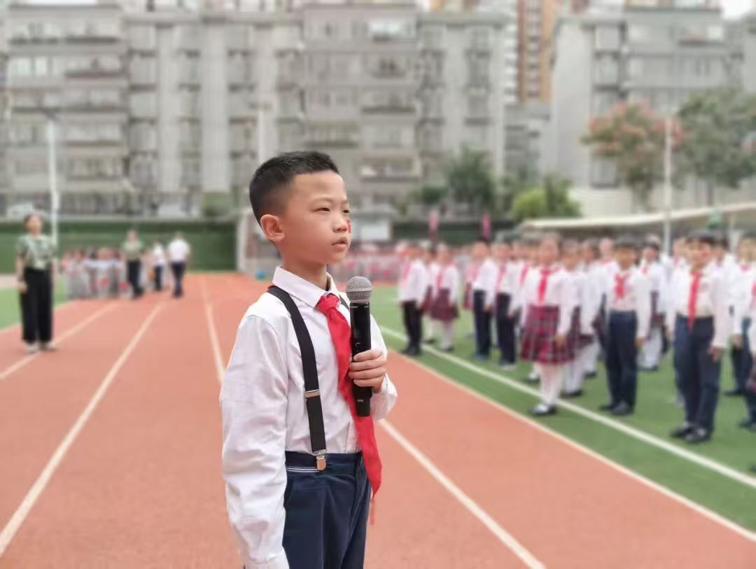 三年级学子先以整齐队列亮相,抬手、迈步动作划一,转体时,队列如刀切般齐整。随后《强军战歌》响彻全场,孩子们眼神坚定、歌声铿锵,曲终齐声喊“胜利”、高举拳头,稚嫩模样满是热血。