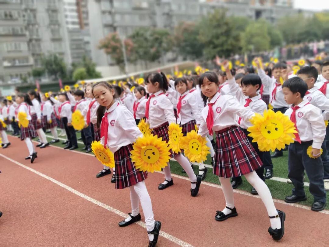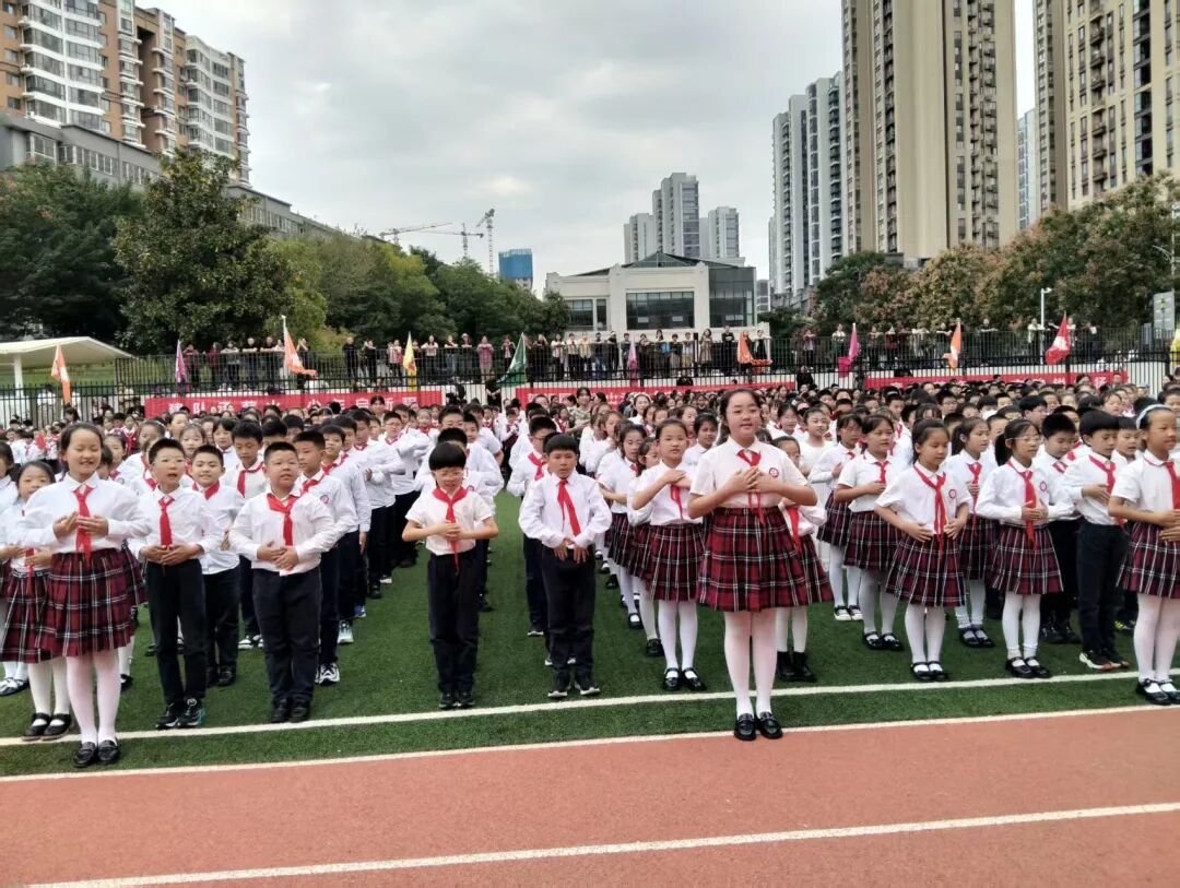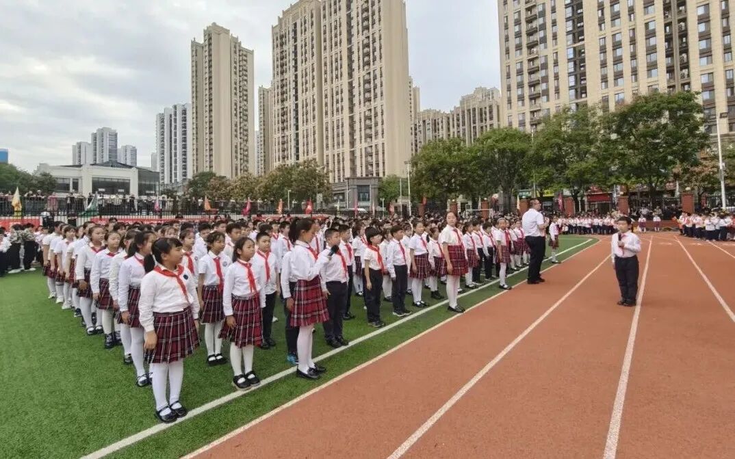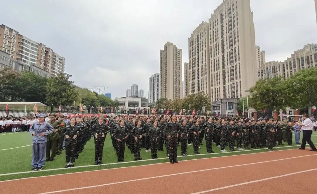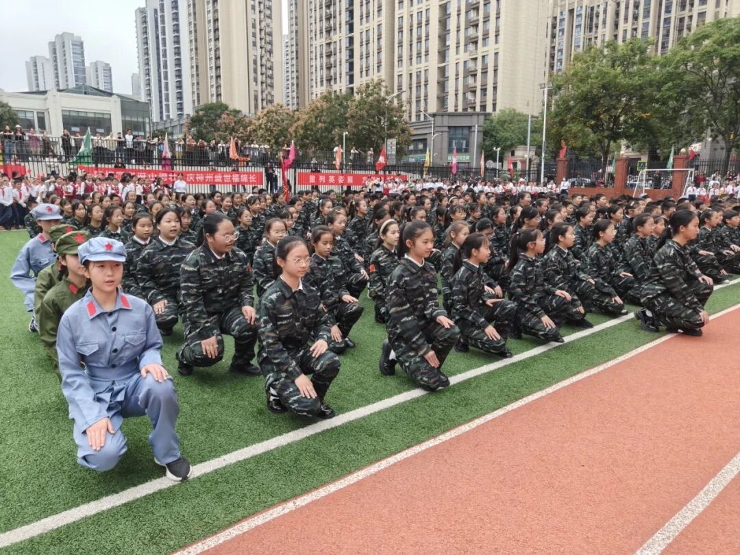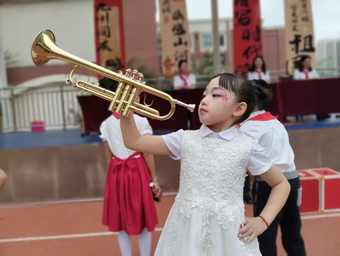 三年级学子先以整齐队列亮相,抬手、迈步动作划一,转体时,队列如刀切般齐整。随后《强军战歌》响彻全场,孩子们眼神坚定、歌声铿锵,曲终齐声喊“胜利”、高举拳头,稚嫩模样满是热血。