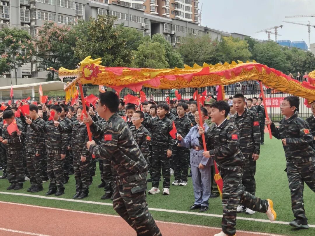 六年级方阵先以队列亮相,队形展示利落有力。转入红歌环节,一条中国龙惊艳登场,龙身翻飞满是少年热血。伴着《保卫黄河》,他们将现场氛围推向高潮,尽显新时代少年精气神。