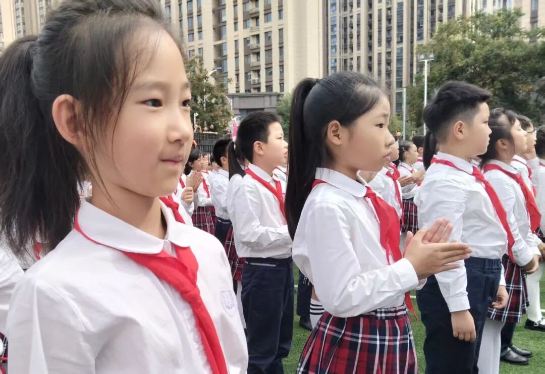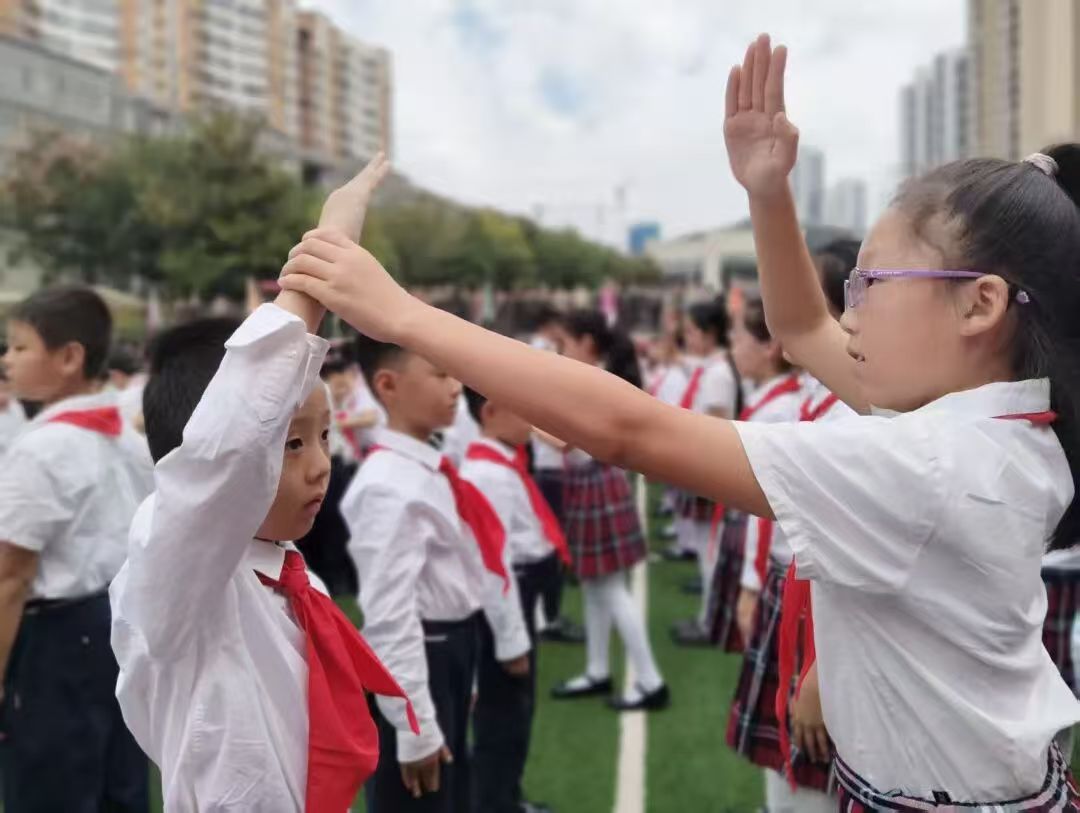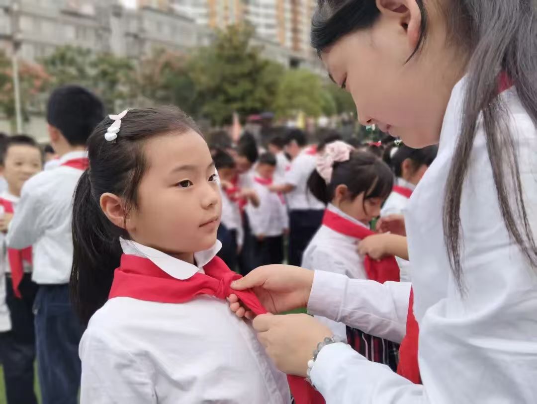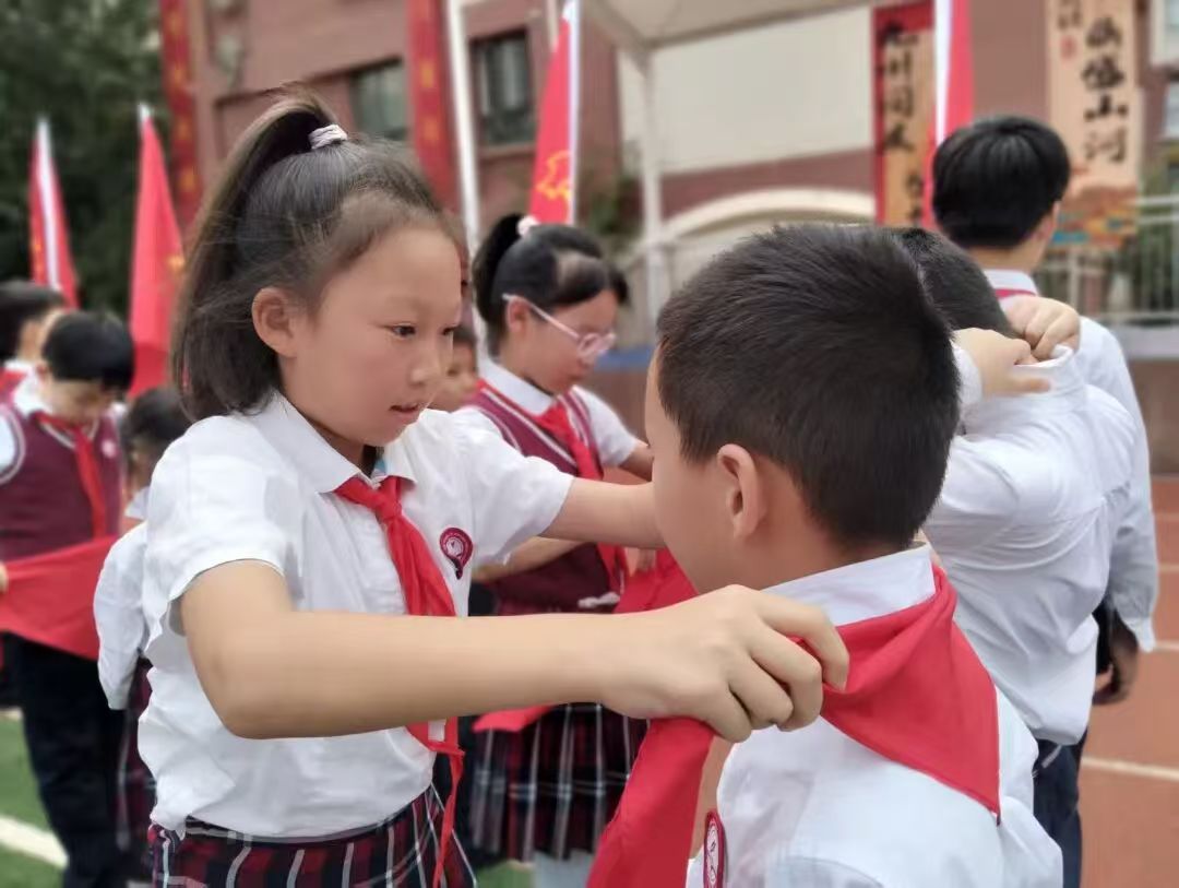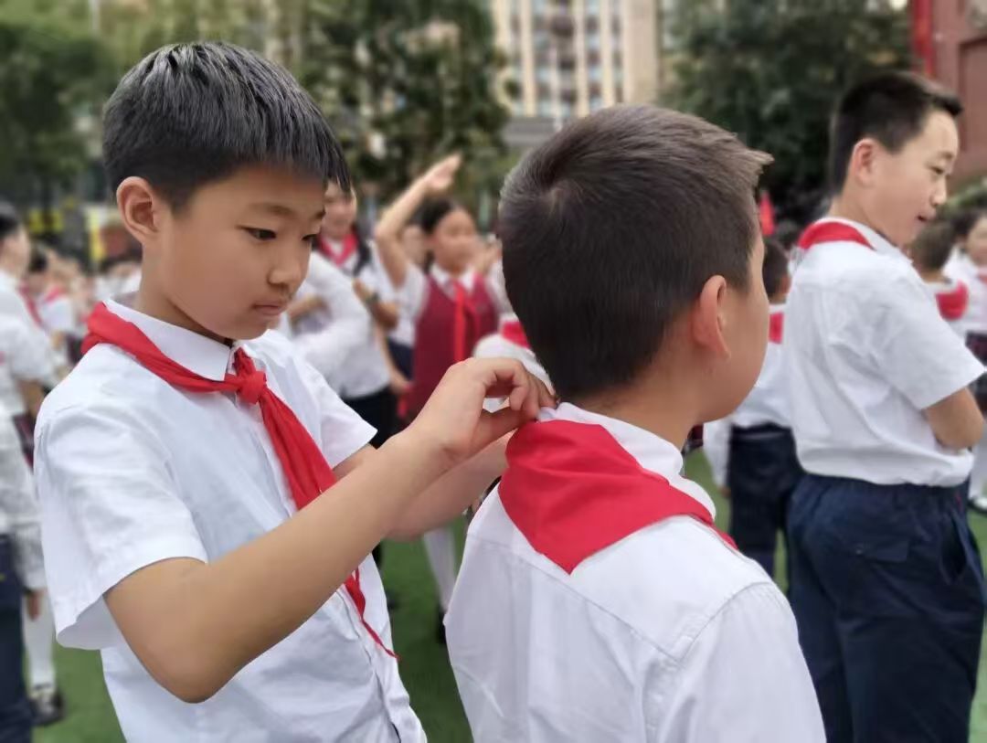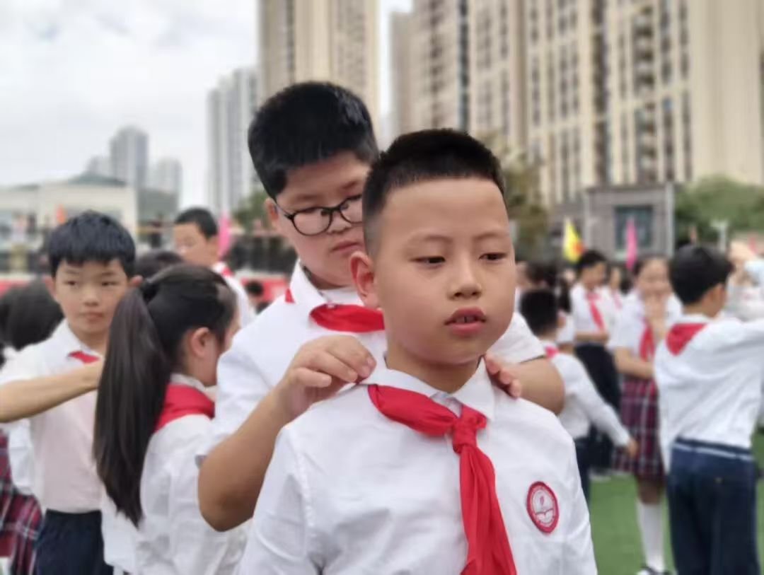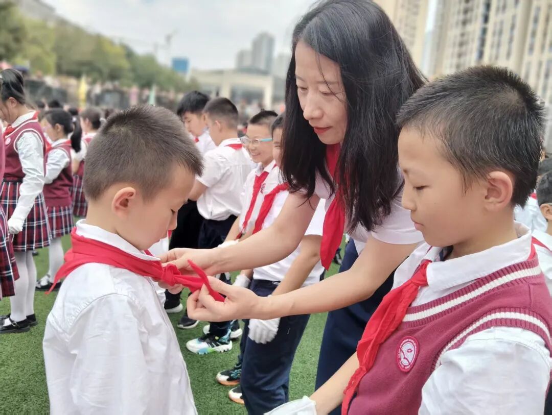 校领导和五年级优秀少先队员代表双手托举红领巾,小心翼翼地为新队员佩戴,一起见证这荣耀时刻。