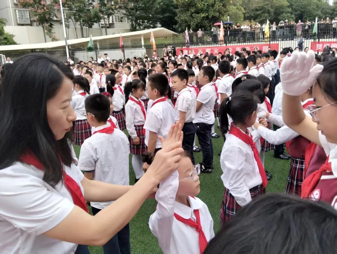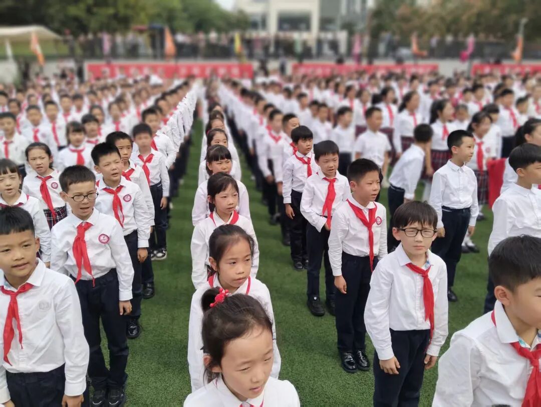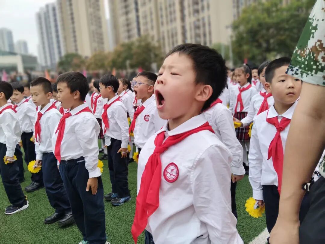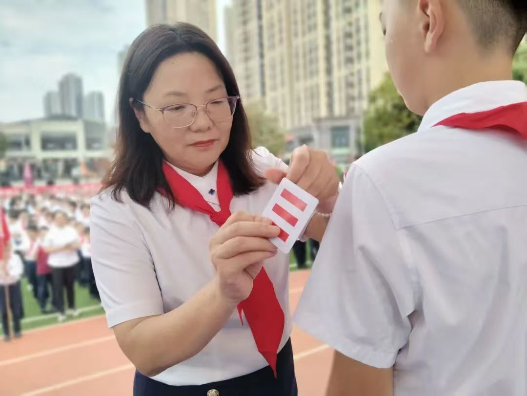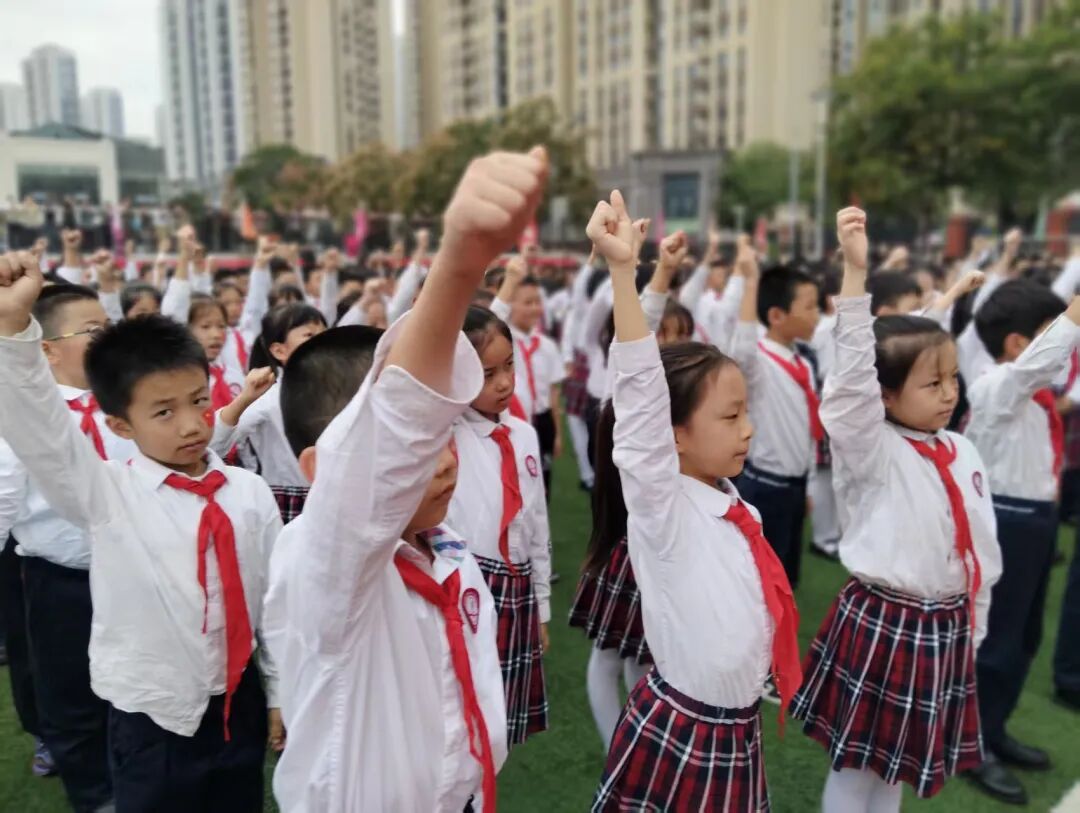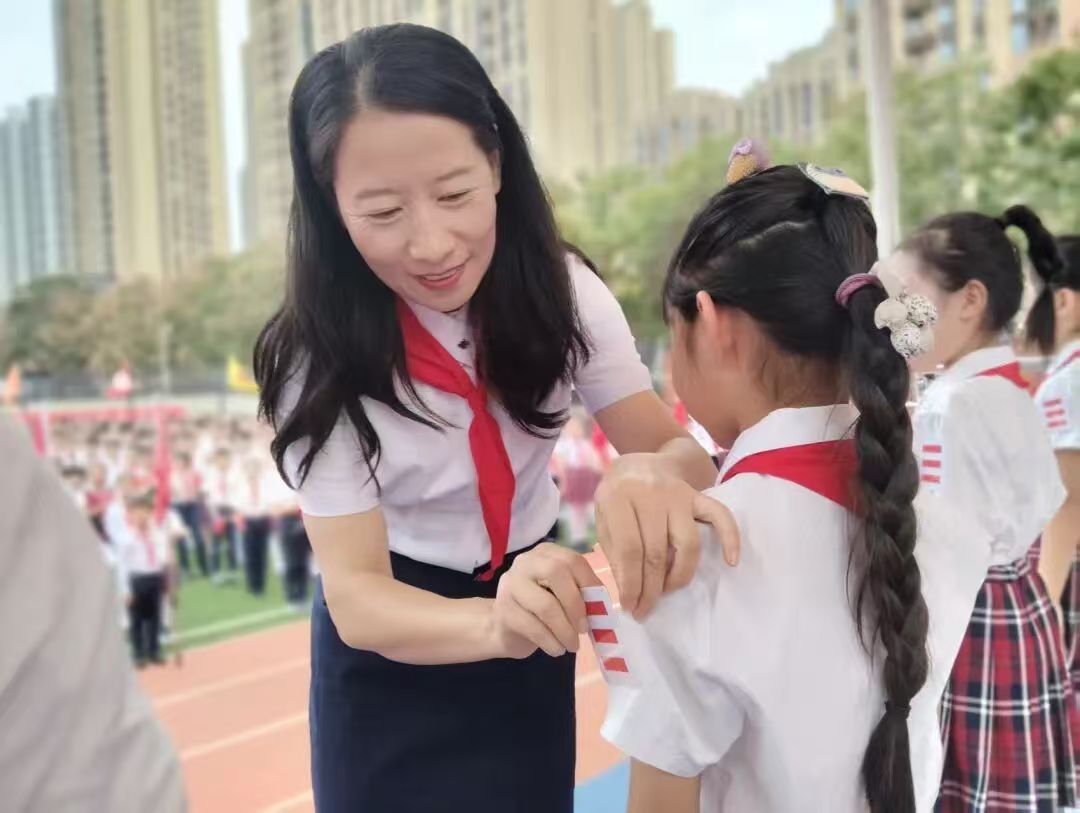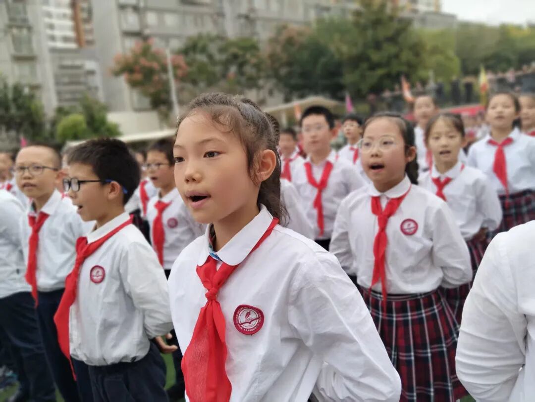 校领导和五年级优秀少先队员代表双手托举红领巾,小心翼翼地为新队员佩戴,一起见证这荣耀时刻。