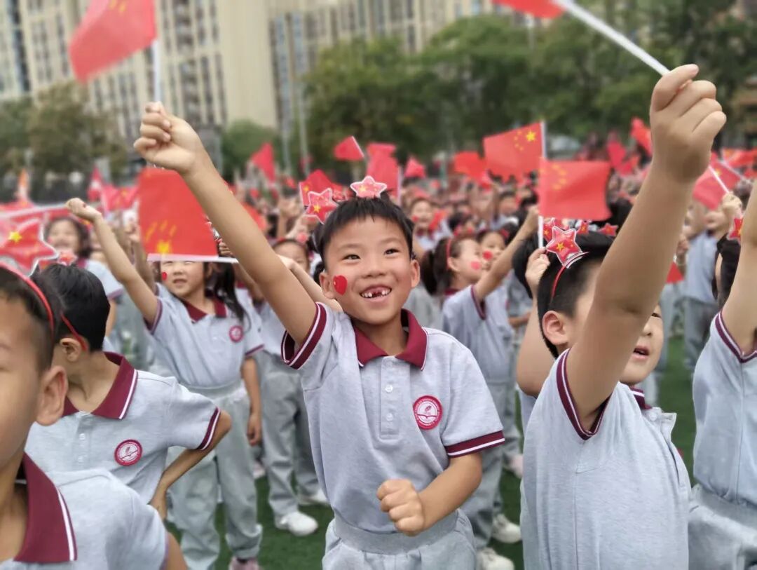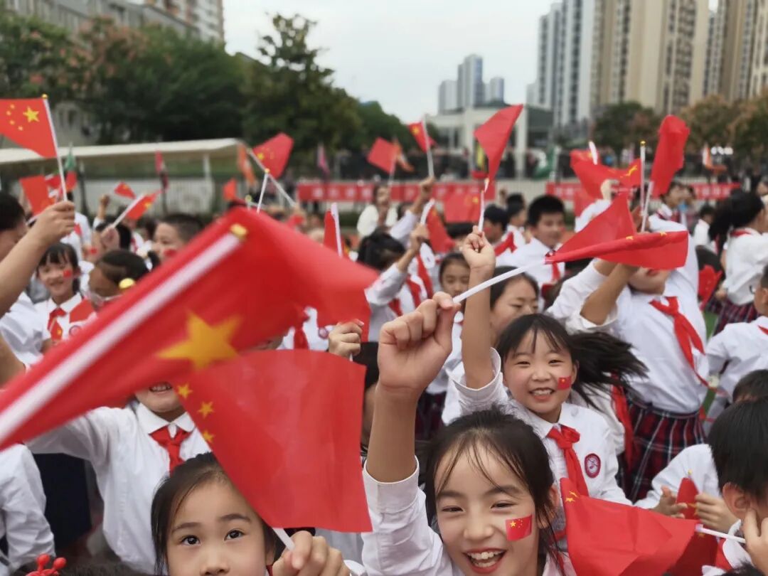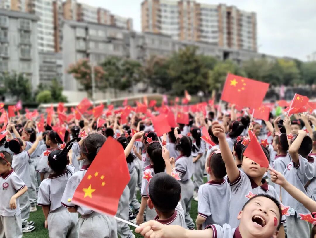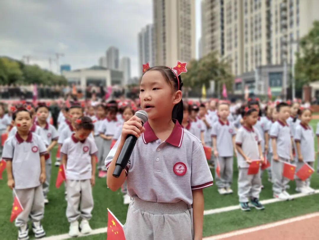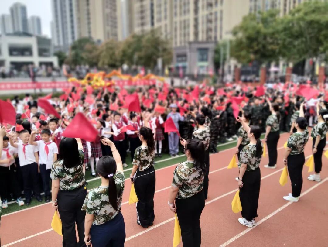 全体师生齐聚一堂,齐声唱响《歌唱祖国》,手中的国旗随旋律挥动,红浪翻涌间,爱国之心在歌声里愈发滚烫。