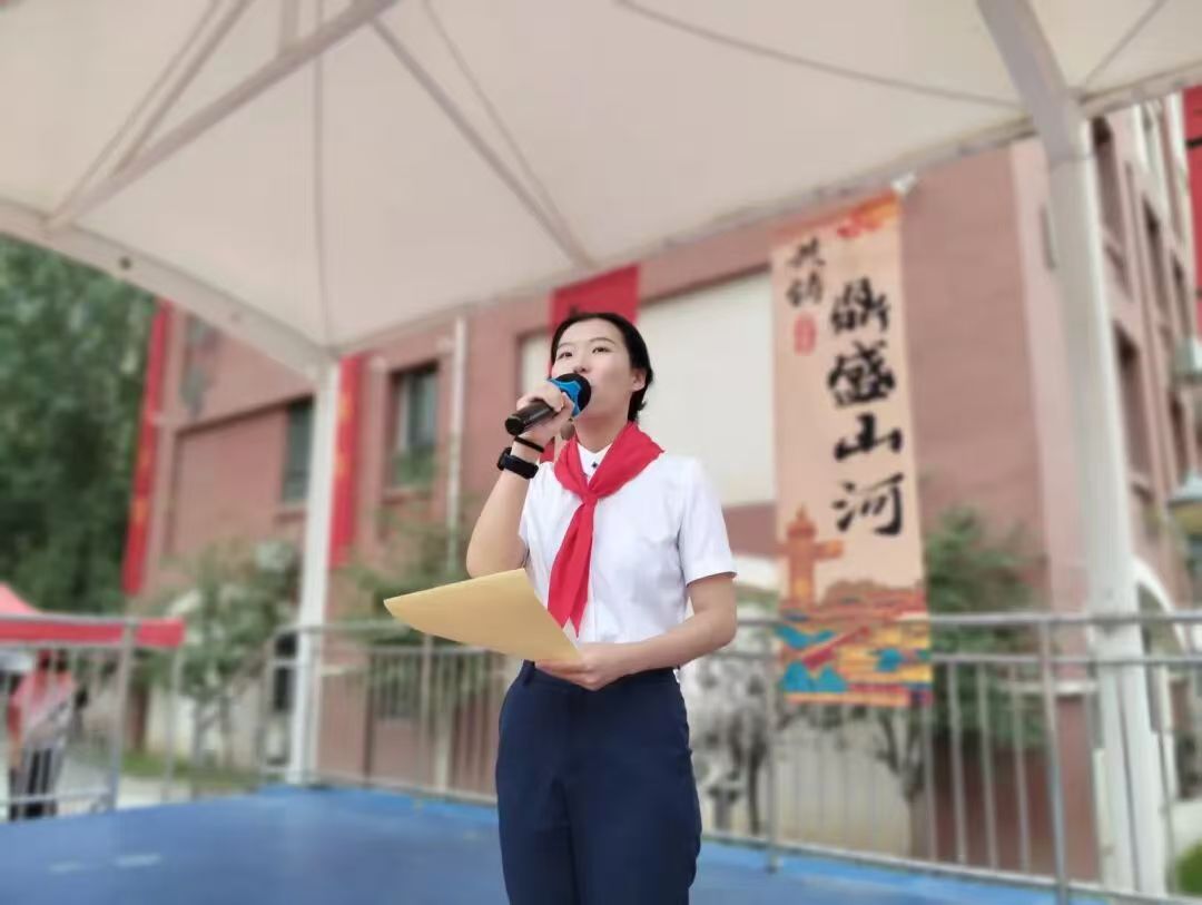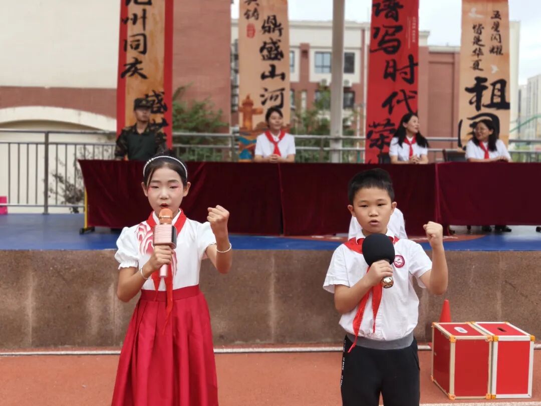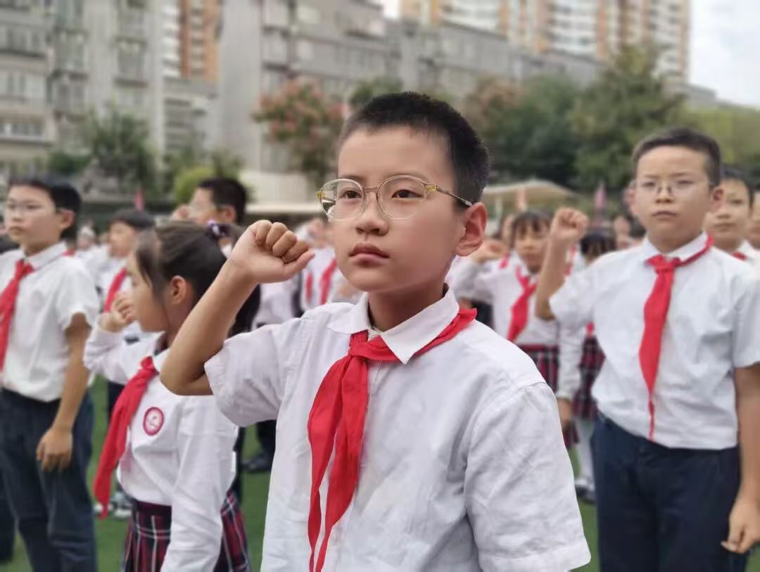 大队长冯炜焯带领新入队队员宣读入队誓词,铮铮誓言,彰显的是坚定不移“听党话、跟党走”的信念和践行“请党放心、强国有我”誓言的决心。
