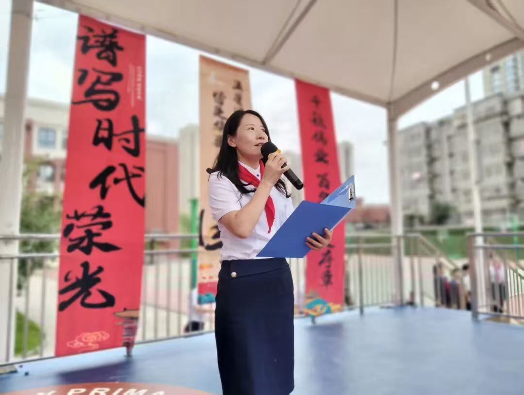 少工委主任沈校长发表了致辞。她鼓励孩子们以红领巾为荣光,立远大志向,养优良品德,祝愿新队员们在星星火炬的指引下,在新时代的号角声中,昂首挺胸走向更加美好的未来。