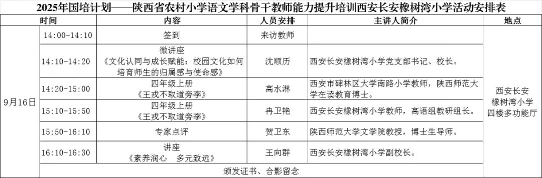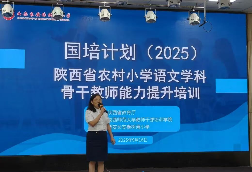 金秋送爽启新程,研思笃行共成长。9 月 16 日,国培计划(2025)——陕西省农村小学语文学科骨干教师能力提升培训活动在西安长安橡树湾小学成功举办。来自全省的51位骨干教师、西安长安橡树湾小学的所有语文教师以及大兆街道三益小学、韦曲街道何家营小学的教师代表们齐聚一堂,以课为媒、以研为翼,共同开启了一场聚焦语文素养、深耕教学实践的专业成长之旅,为小学语文教育发展注入鲜活力量。