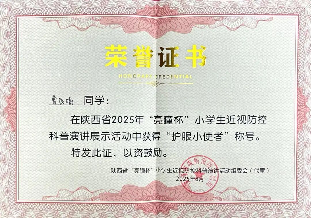 曹辰曦同学在陕西省2025年“亮瞳杯”小学生近视防控科普演讲展示活动中获得“护眼小使者”称号。
