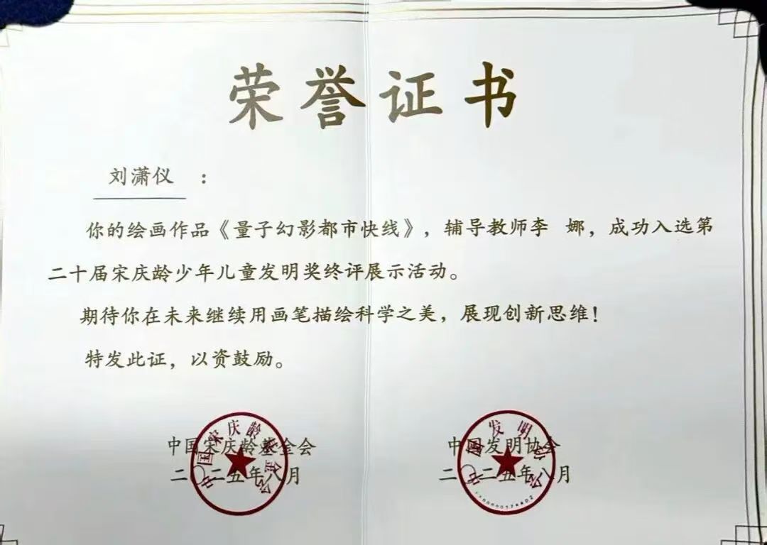 刘潇仪同学成功入选第二十届宋庆龄少年儿童发明奖终评展示活动。