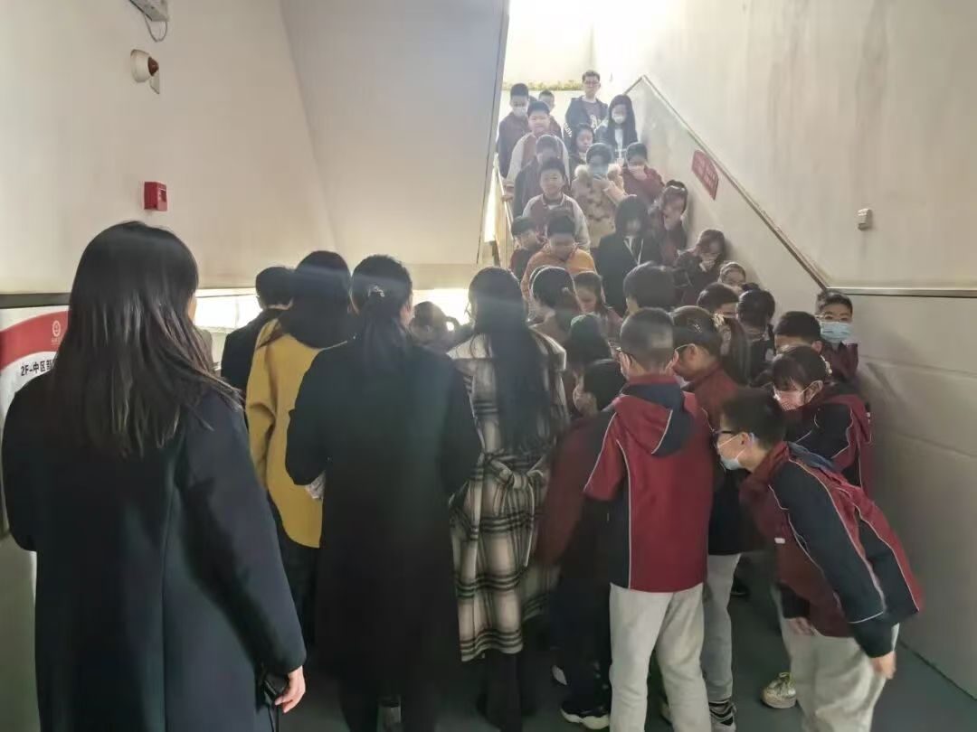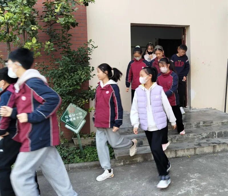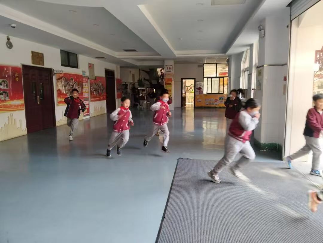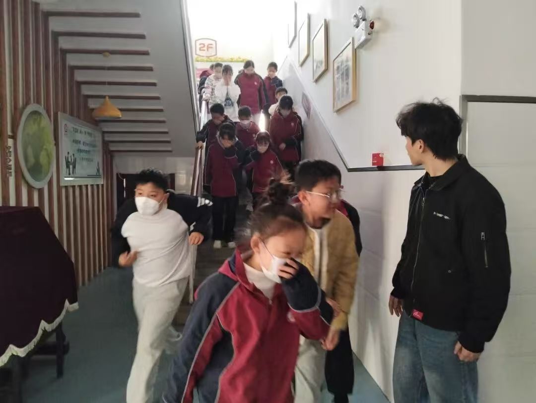 一阵急促的消防警报声响起,消防演练正式拉开帷幕,各楼层负责老师指引学生快速、有序撤离。同学们在老师的带领下,弯腰捂鼻,迅速向学校安全区域集结。