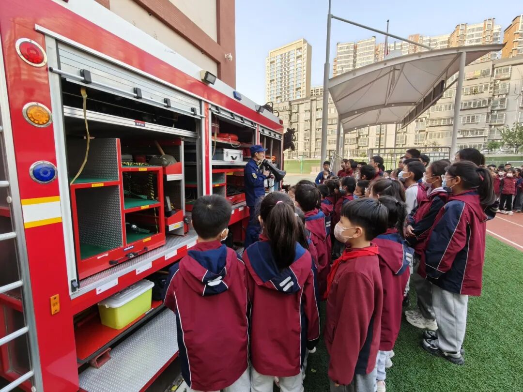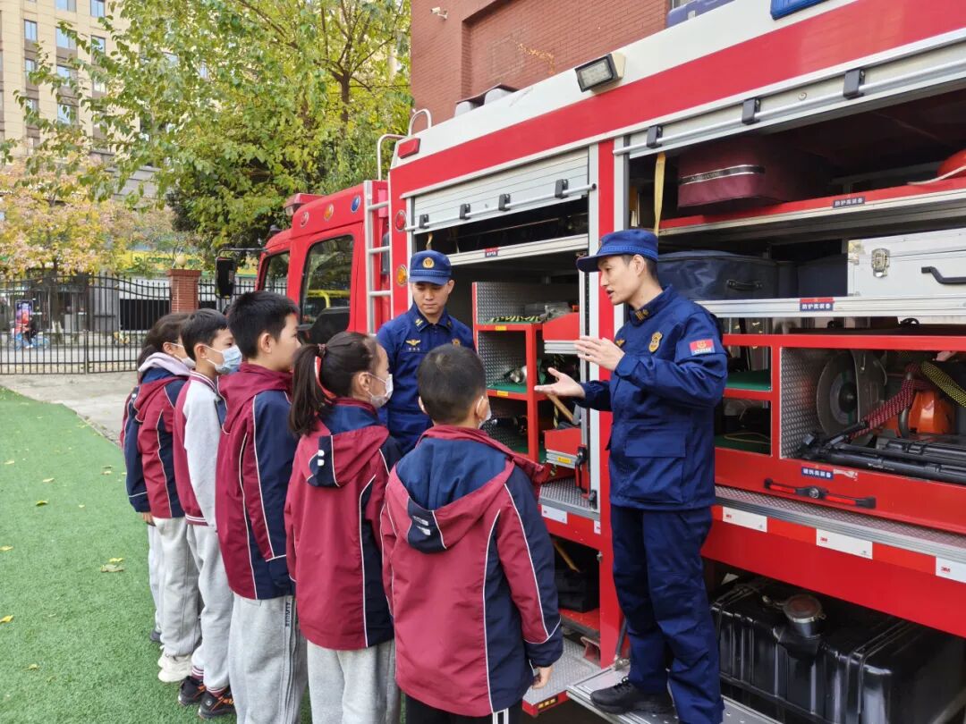 消防员带领同学们参观消防车,展示消防车上的消防水枪、消防梯、破拆工具、急救箱等装备,每一件都藏着守护安全的奥秘。让同学们在近距离接触中,真切感受到消防装备的功能强大和消防员的责任与担当。