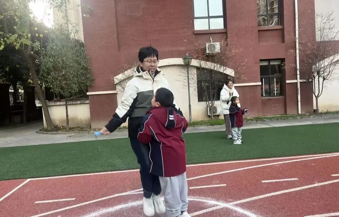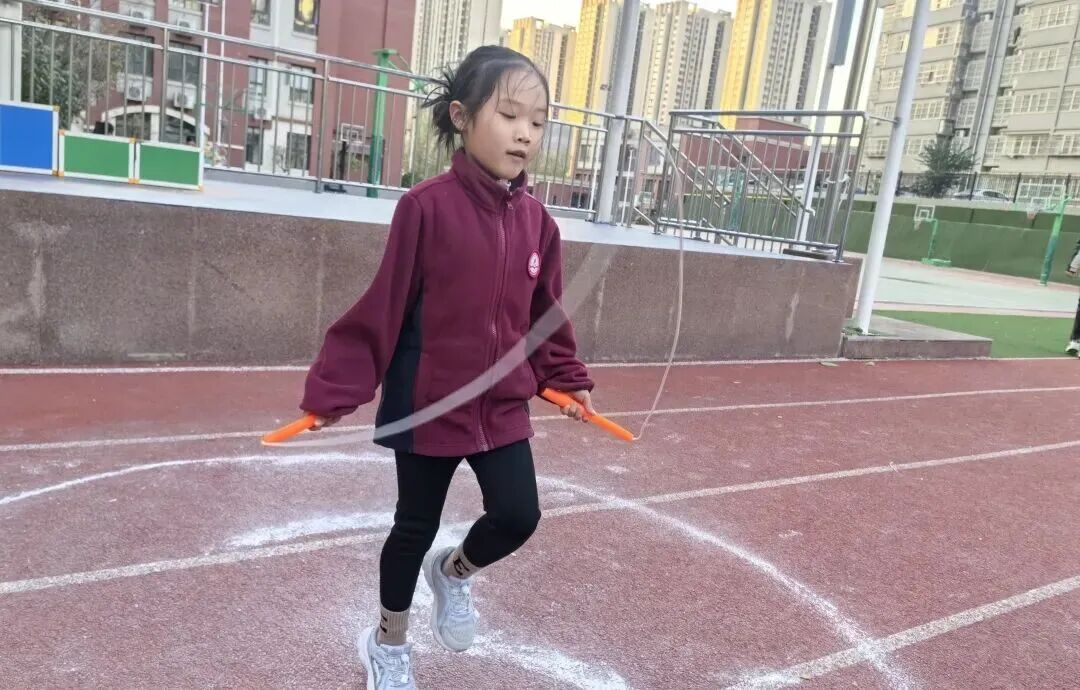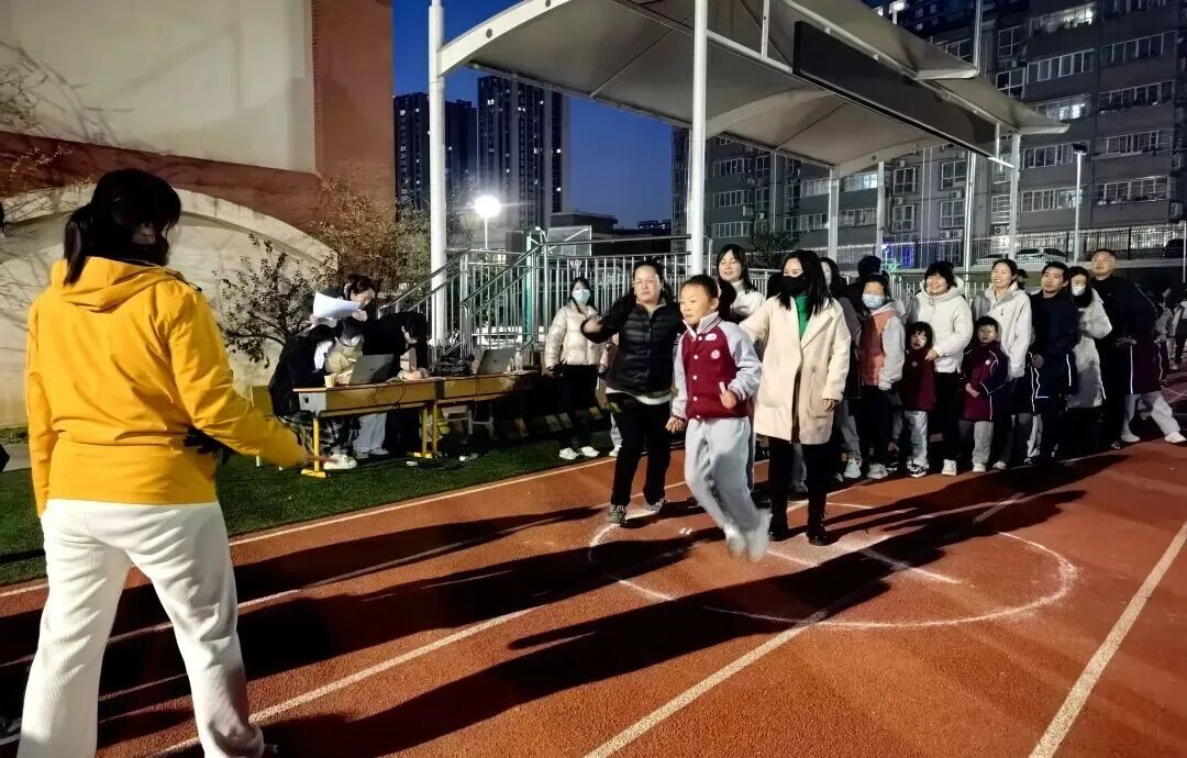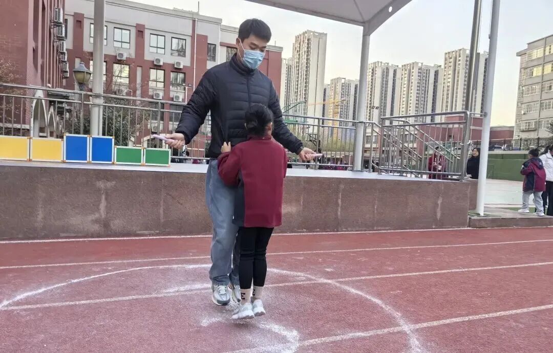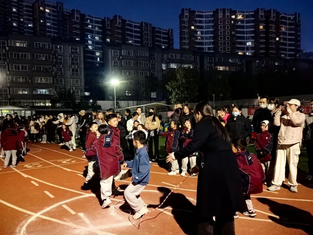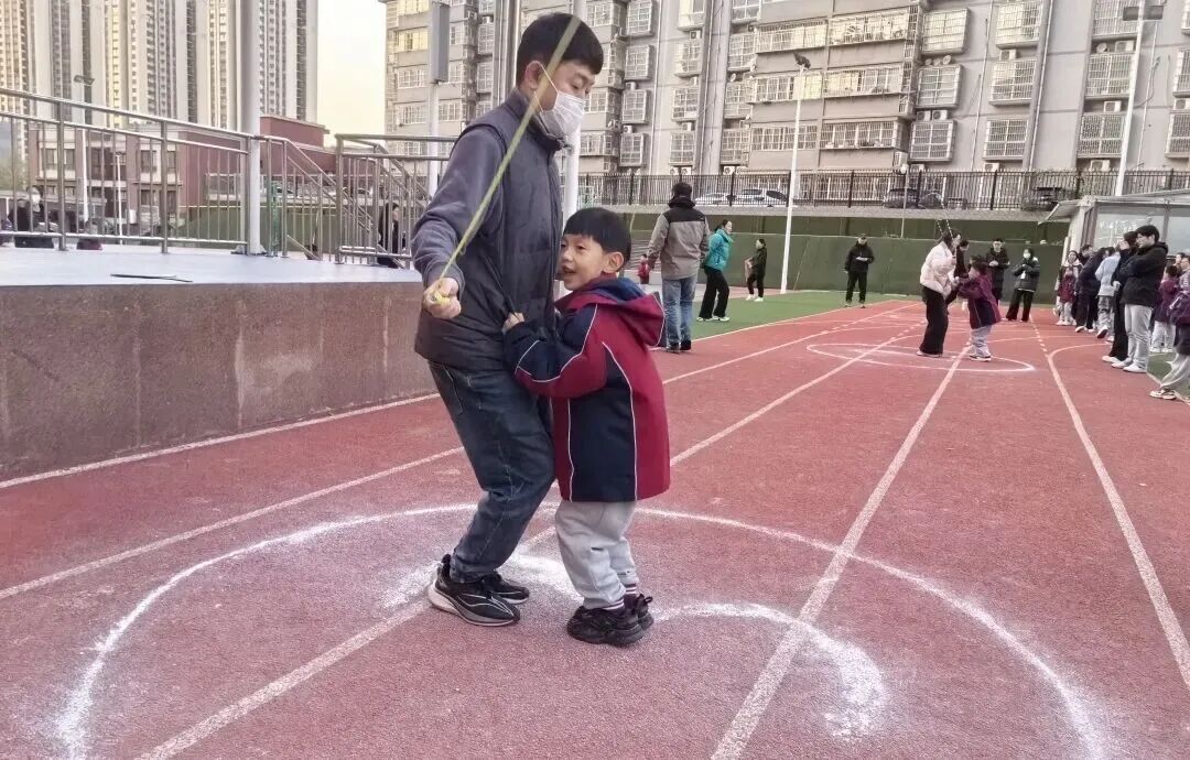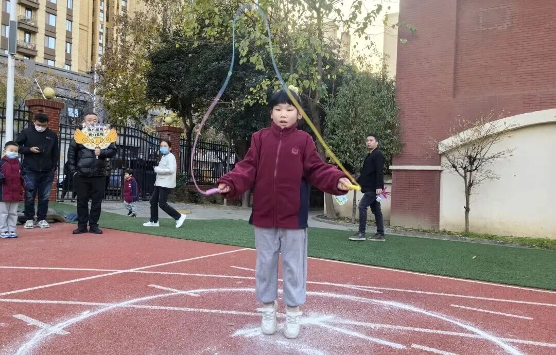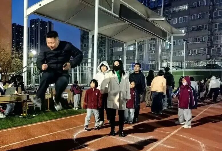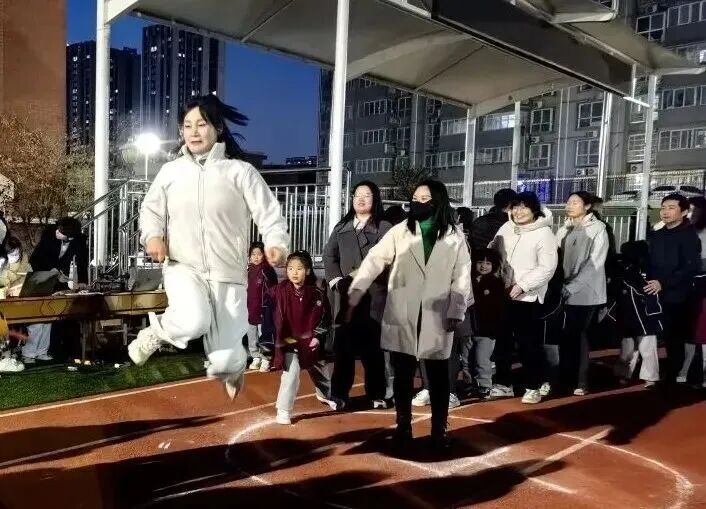 家长和孩子手牵手摇着绳柄,满是童趣;两人脚跟着脚一起跳,心里全是欢喜;清脆的绳声伴着风,洒得满场都是笑声。