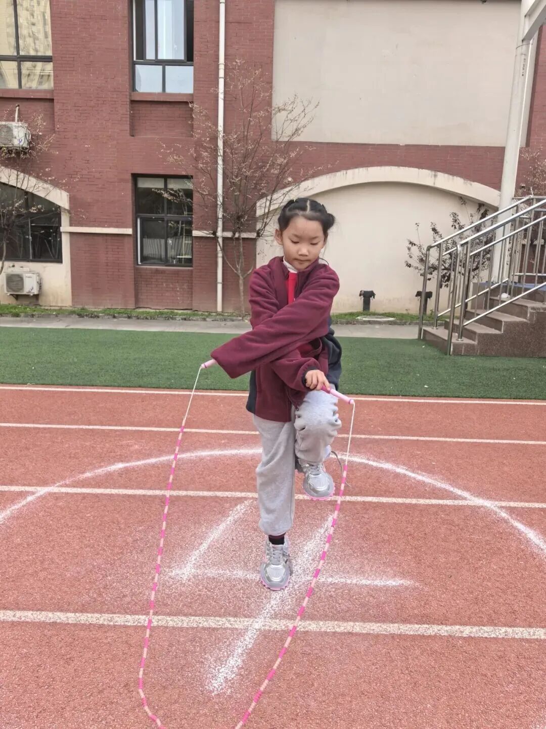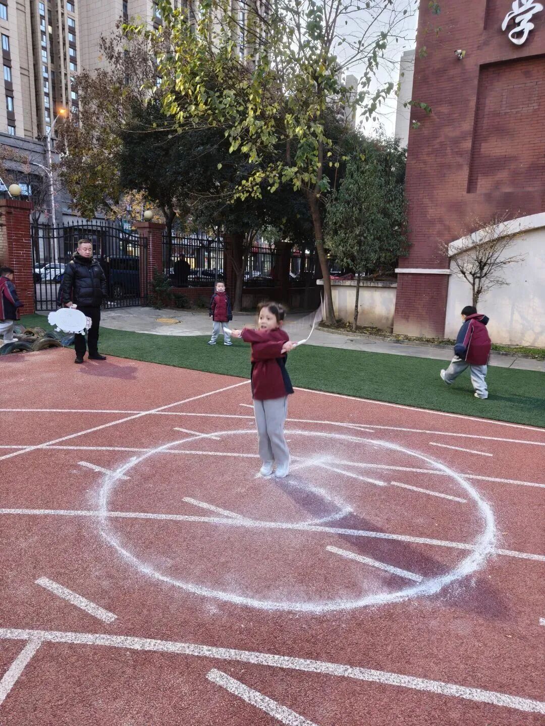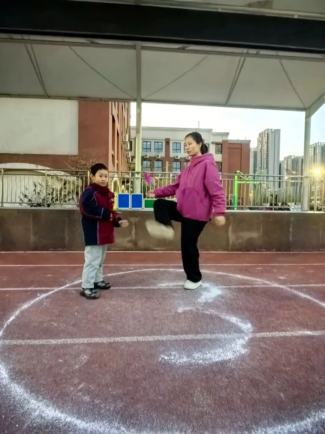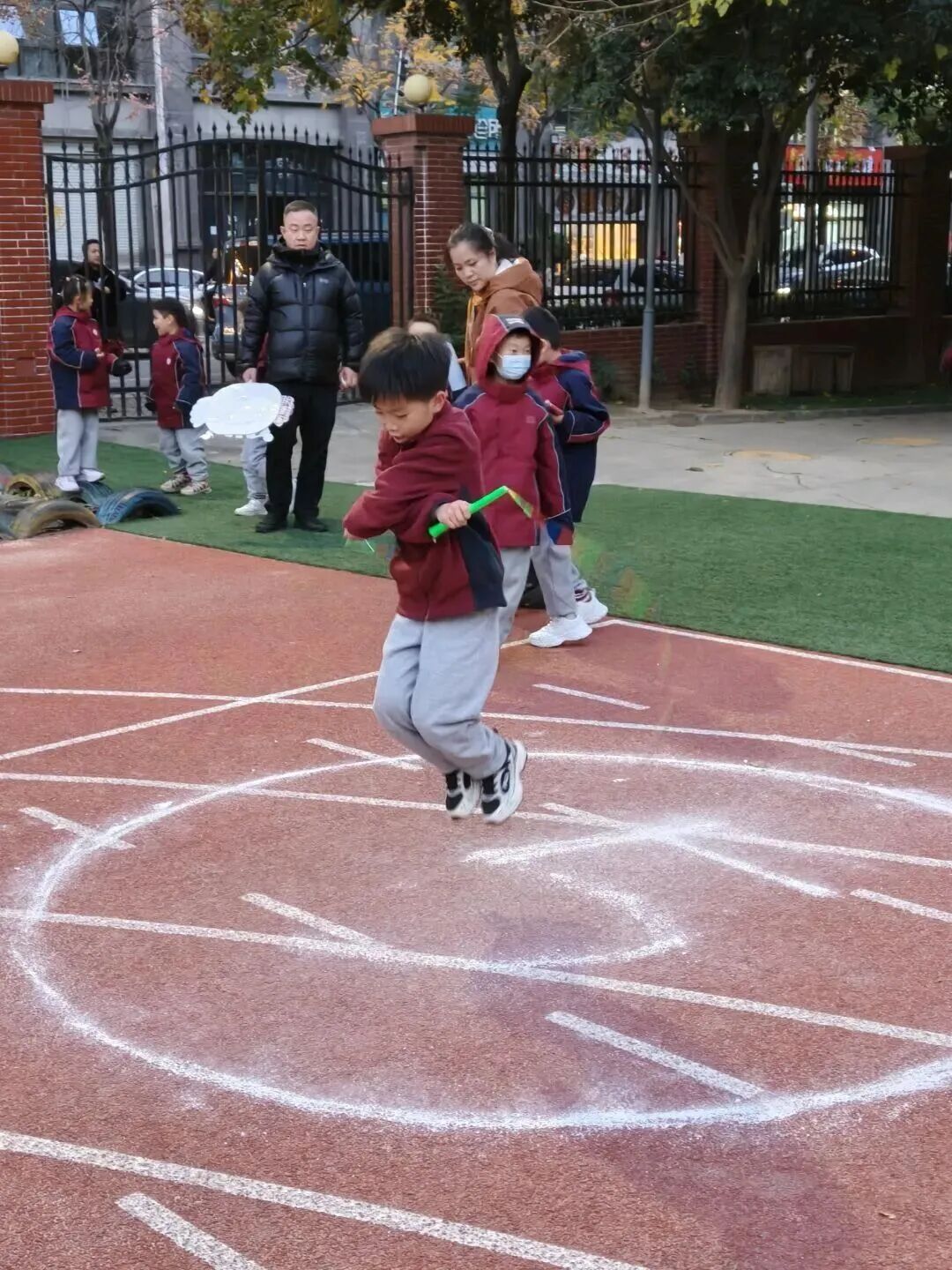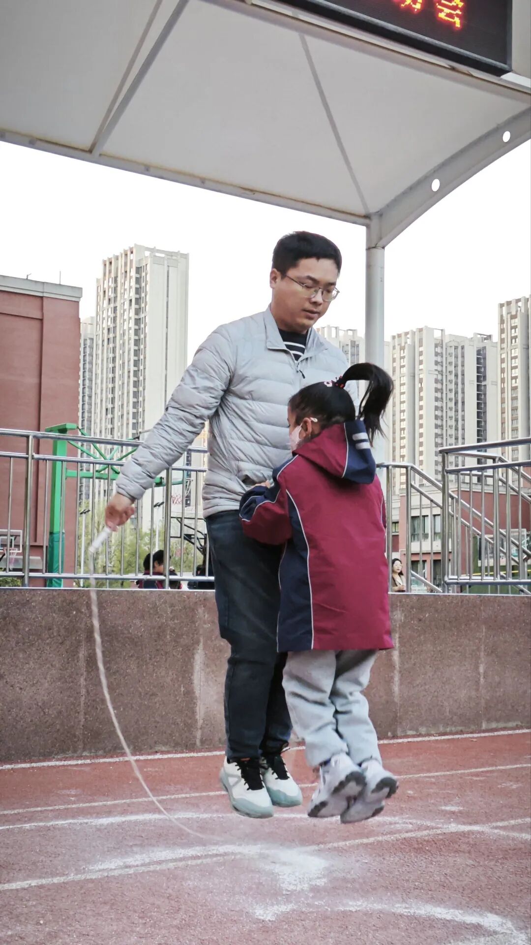 家长和孩子手牵手摇着绳柄,满是童趣;两人脚跟着脚一起跳,心里全是欢喜;清脆的绳声伴着风,洒得满场都是笑声。