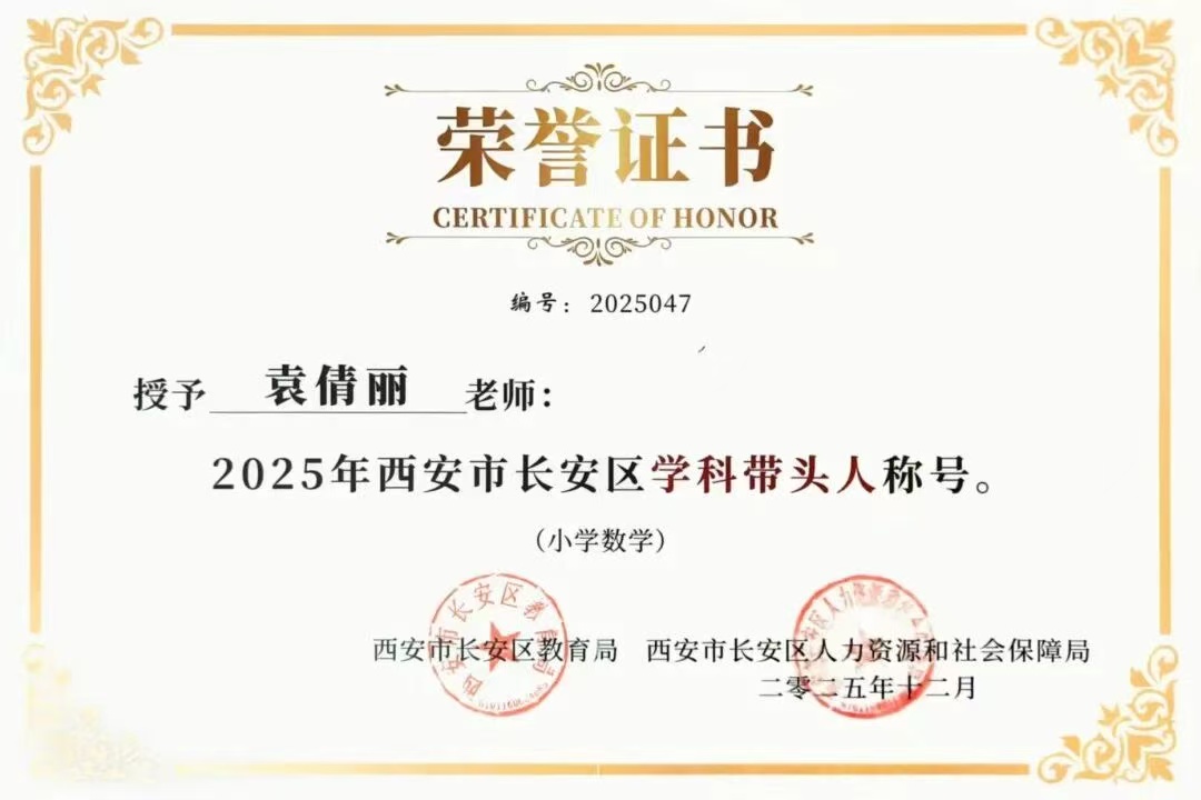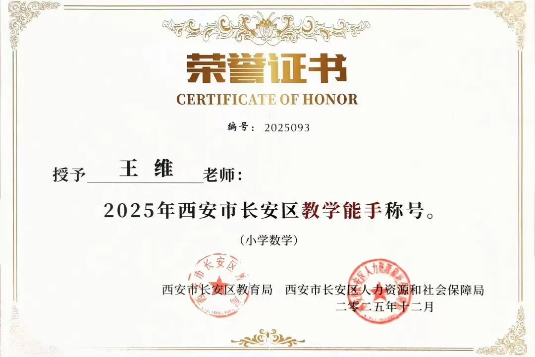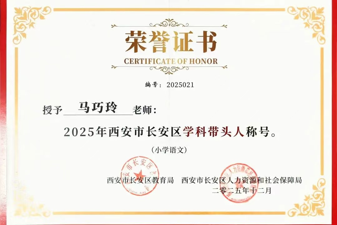 在长安区教学能手与学科带头人的评选中,我校王维老师荣获“2025年西安市长安区教学能手”称号,袁倩丽、马巧玲两位老师荣获“2025年西安市长安区学科带头人”称号。