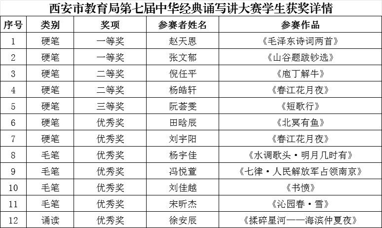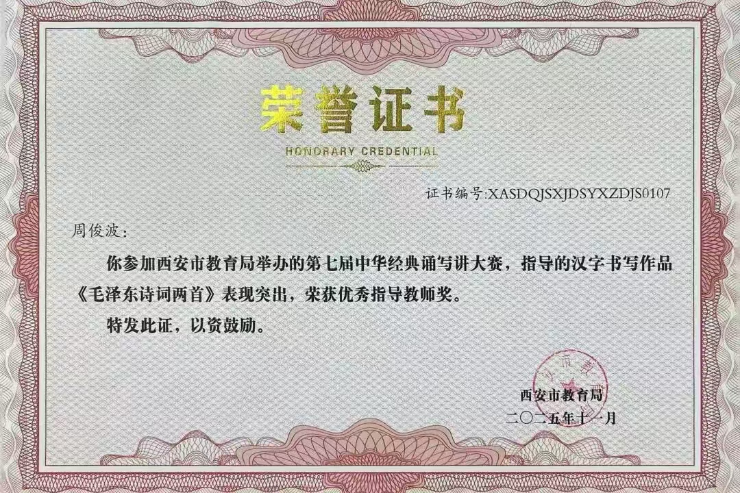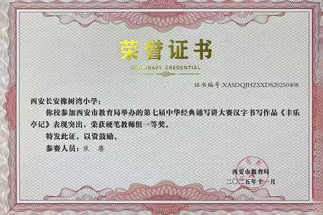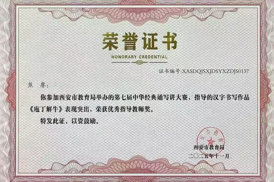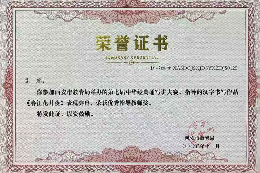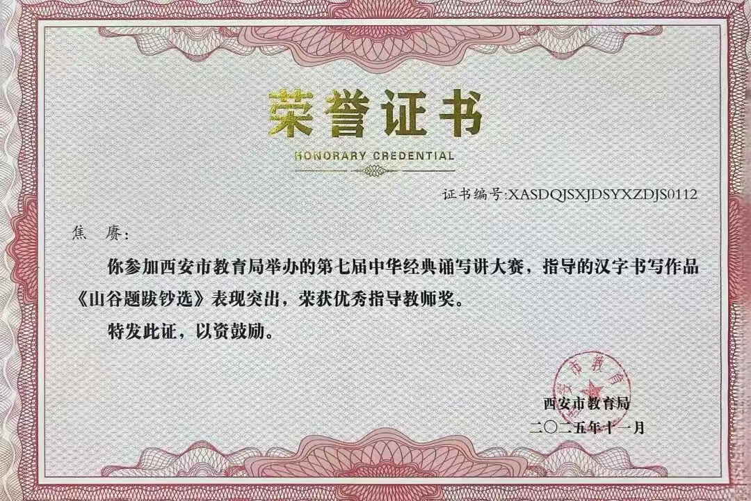 西安市教育局第七届中华经典诵写讲大赛中,我校焦赓老师荣获硬笔教师组一等奖及三项优秀指导教师奖;徐伟老师荣获硬笔教师组二等奖;周俊波老师荣获优秀指导教师奖。