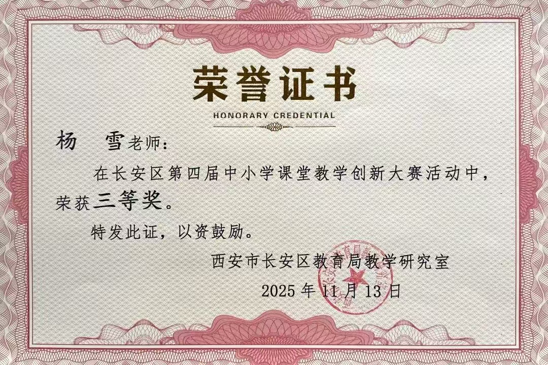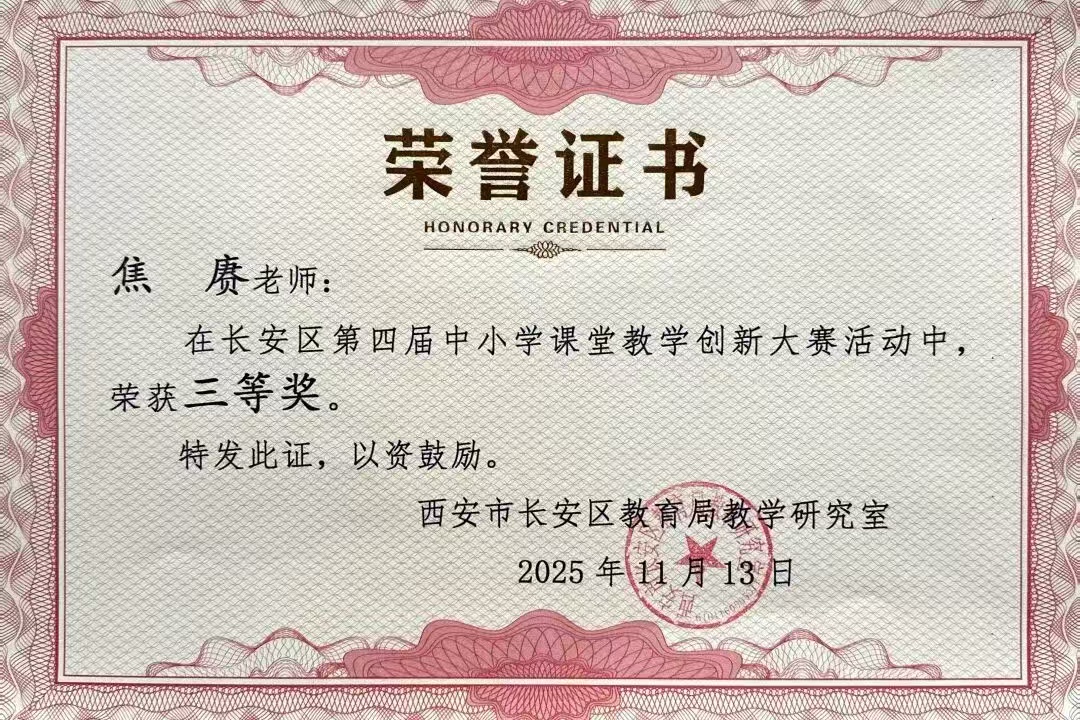 在长安区第四届中小学课堂教学创新大赛中,我校郭瞳瞳、杨雪、焦赓三位老师凭借创新的课堂设计理念与扎实的教学实践能力,均荣获三等奖。