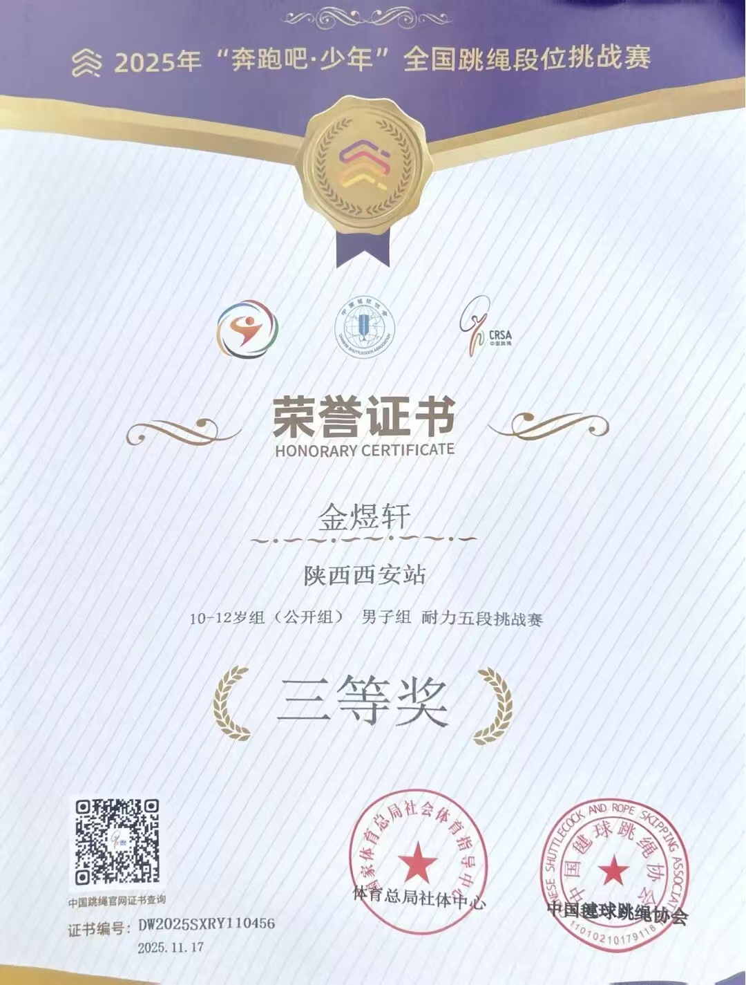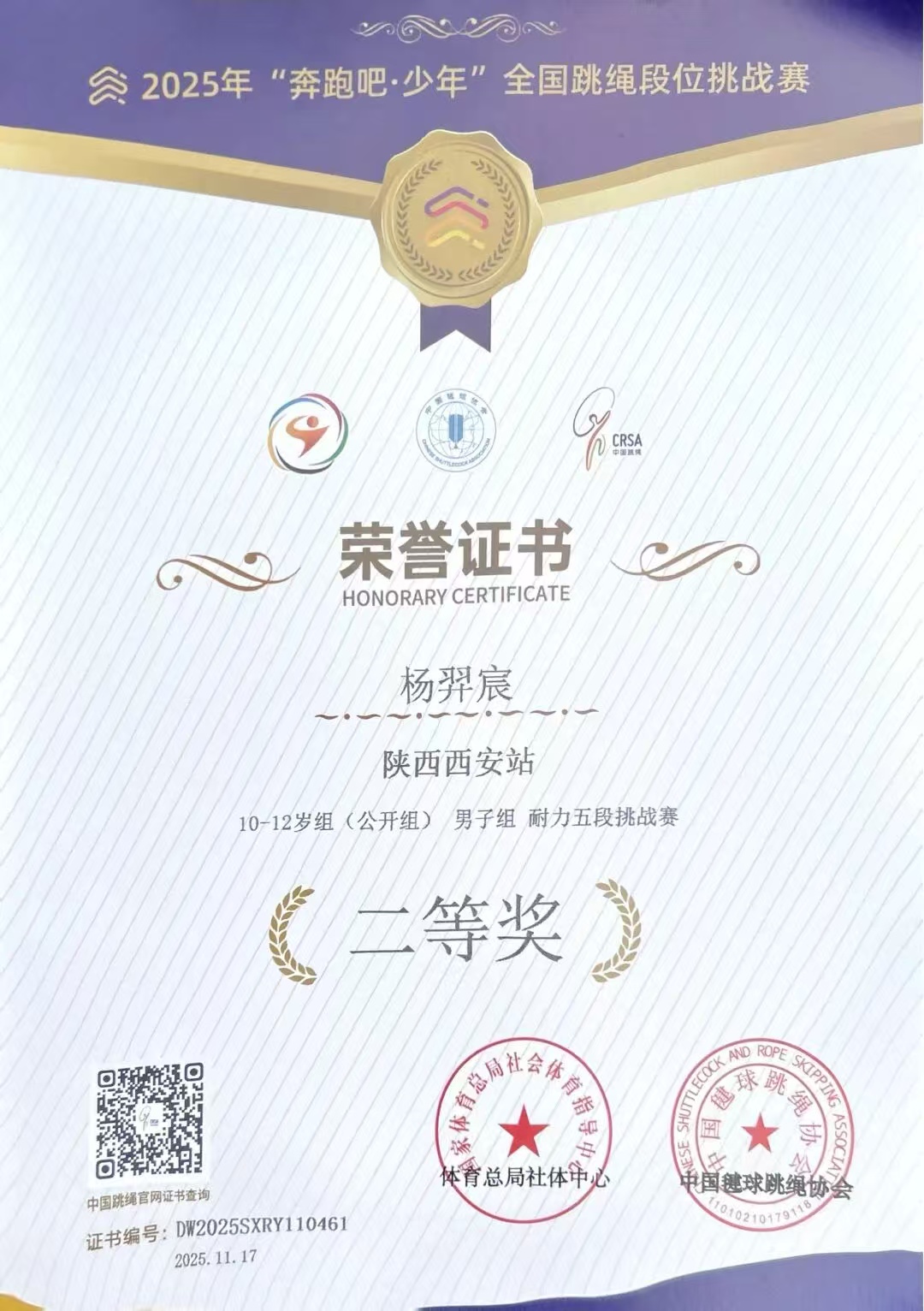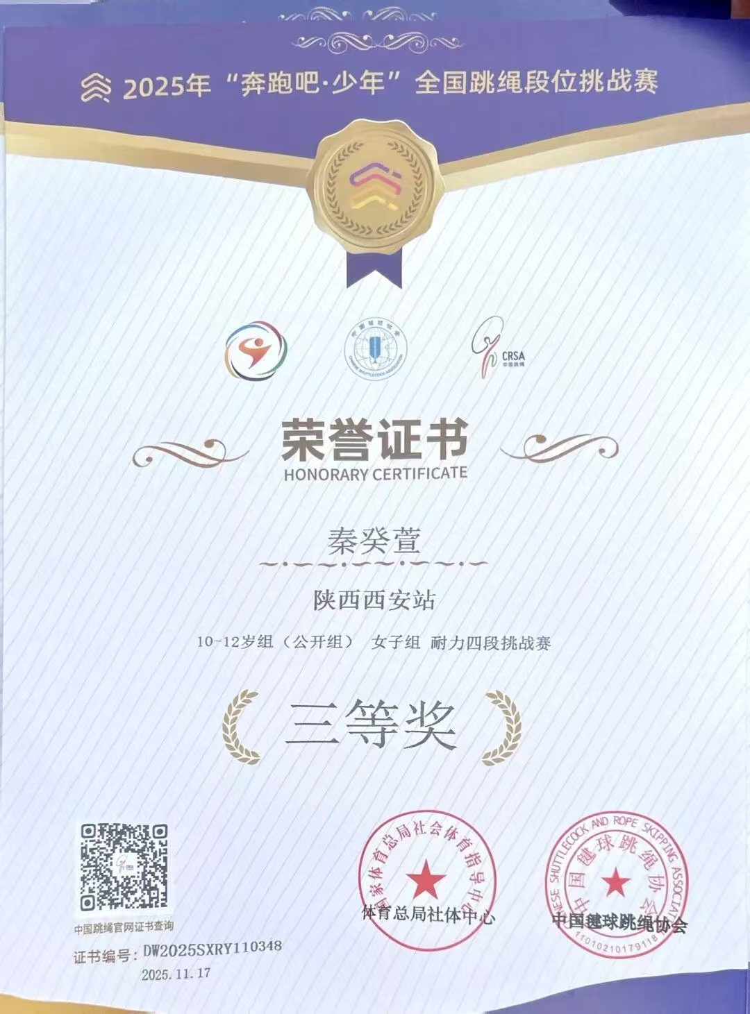 在国家体育总局社会体育指导中心、中国键球跳绳协会联合举办的2025年“奔跑吧·少年”全国跳绳段位挑战赛中,我校4位学生秦癸萱、杨羿宸、金煜轩、梁齐骏力克赛场强手,经受体能与耐力的考验,凭借平日的刻苦训练,绳影翻飞间绽放少年风采,斩获多项荣誉。