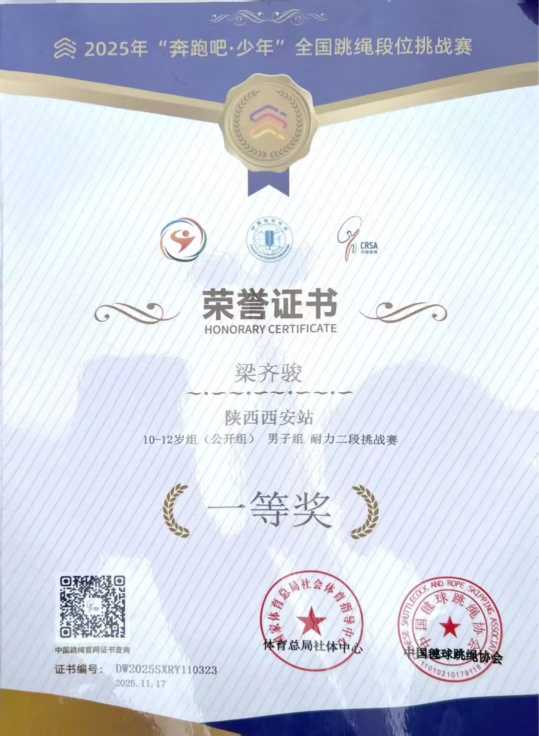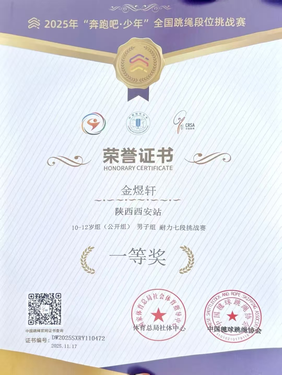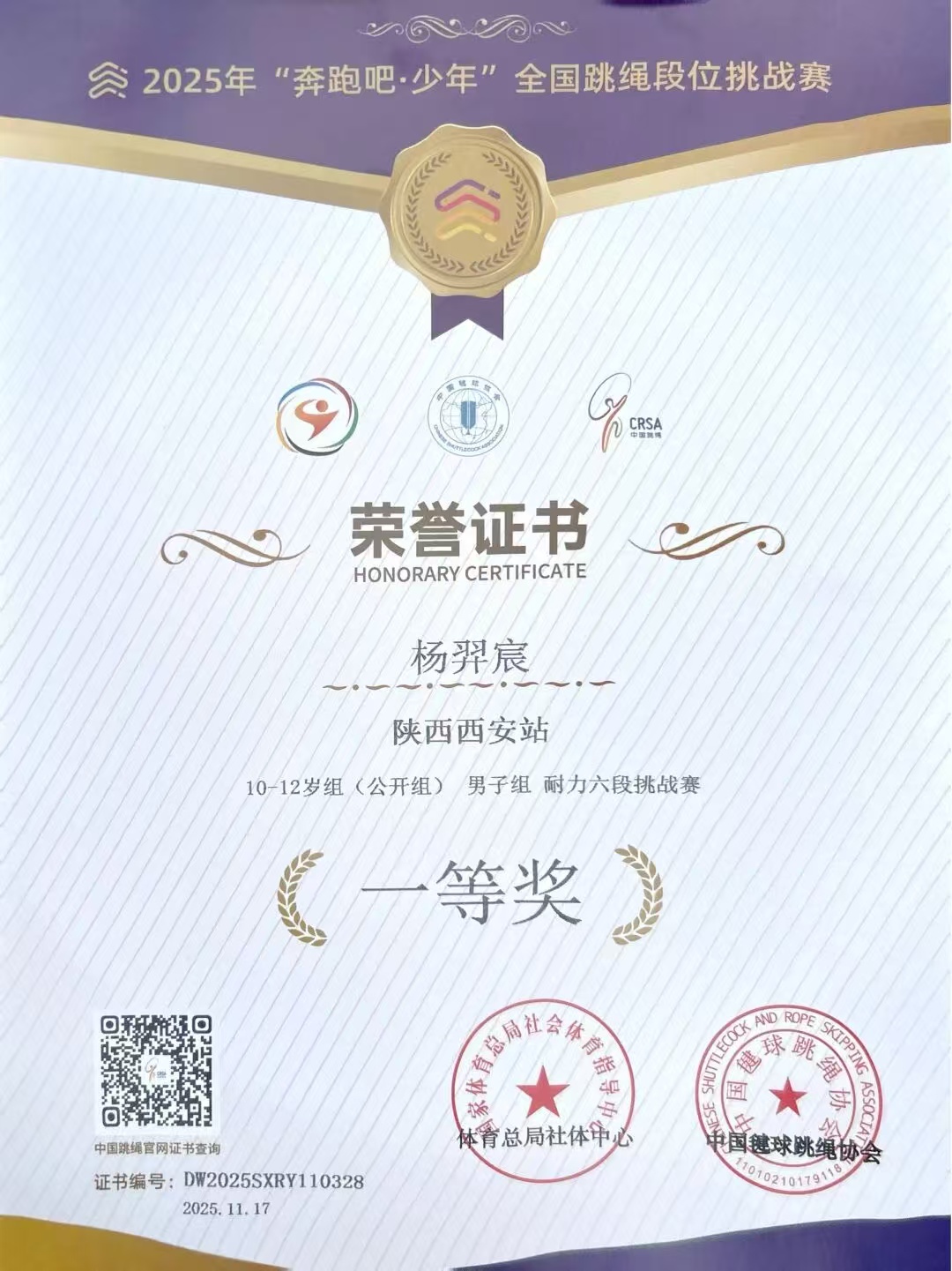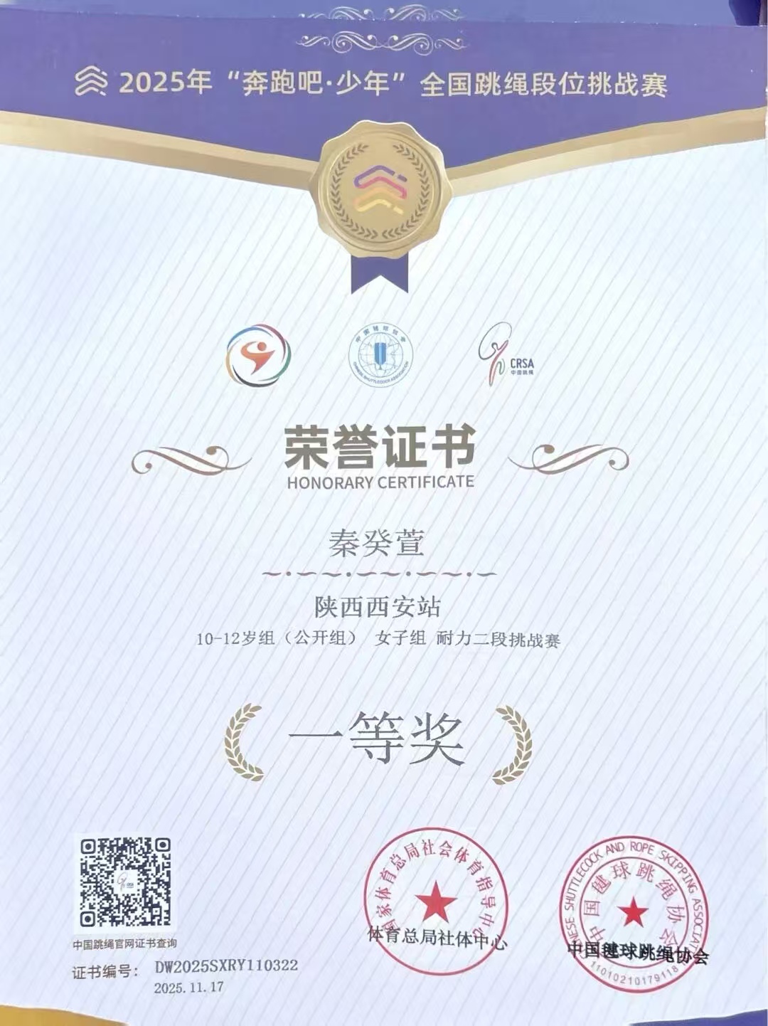 在国家体育总局社会体育指导中心、中国键球跳绳协会联合举办的2025年“奔跑吧·少年”全国跳绳段位挑战赛中,我校4位学生秦癸萱、杨羿宸、金煜轩、梁齐骏力克赛场强手,经受体能与耐力的考验,凭借平日的刻苦训练,绳影翻飞间绽放少年风采,斩获多项荣誉。