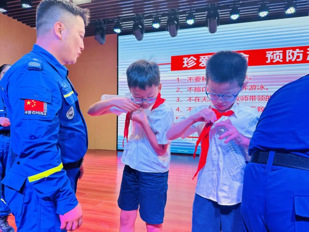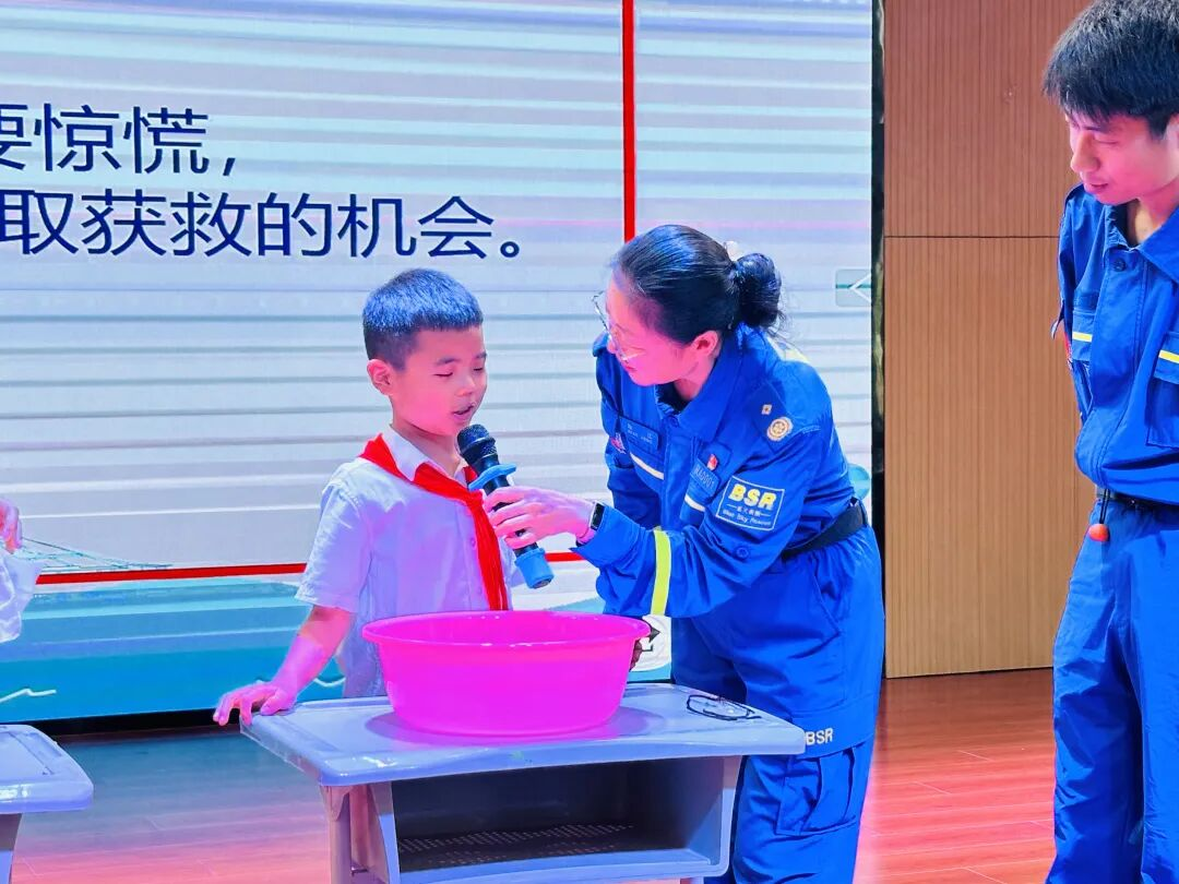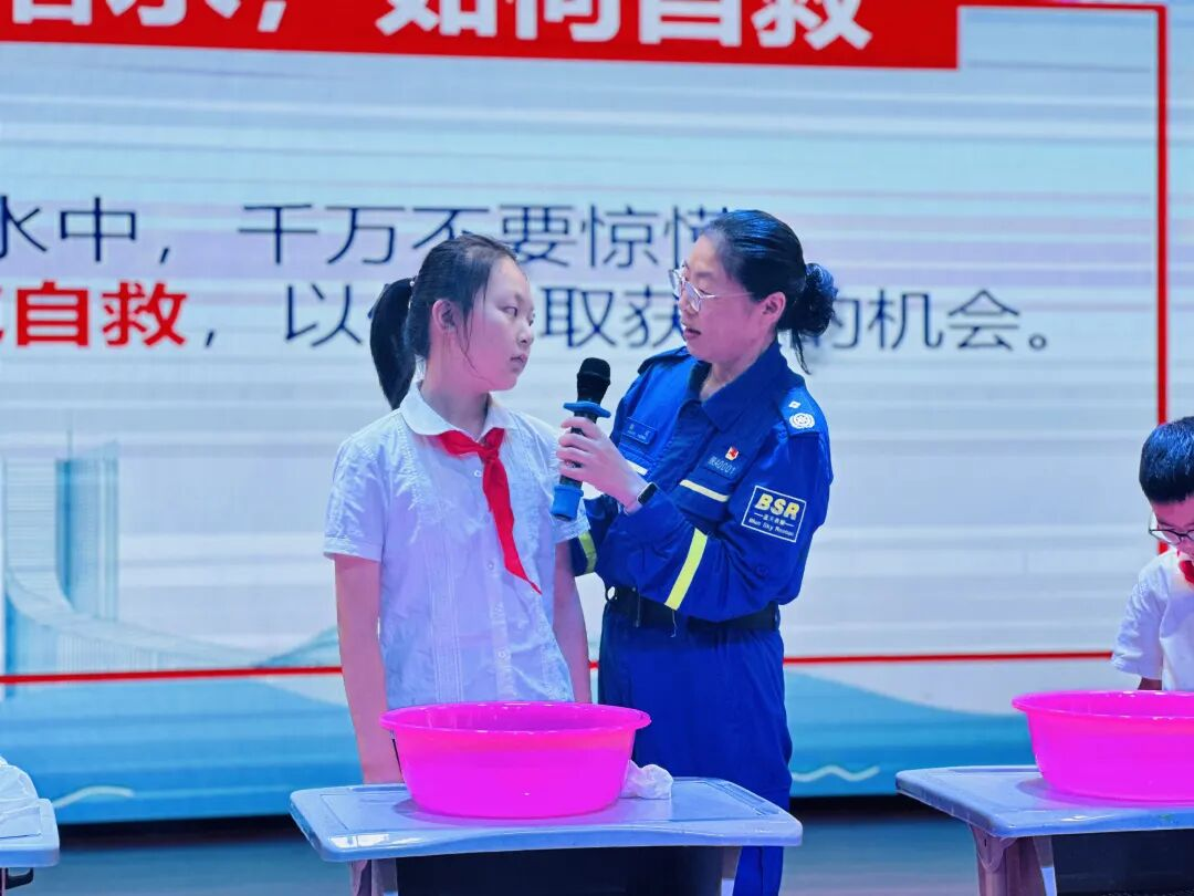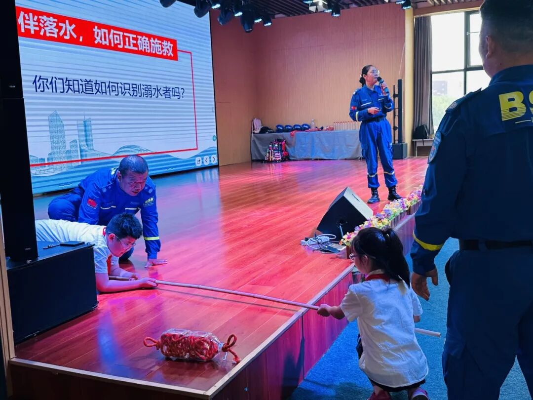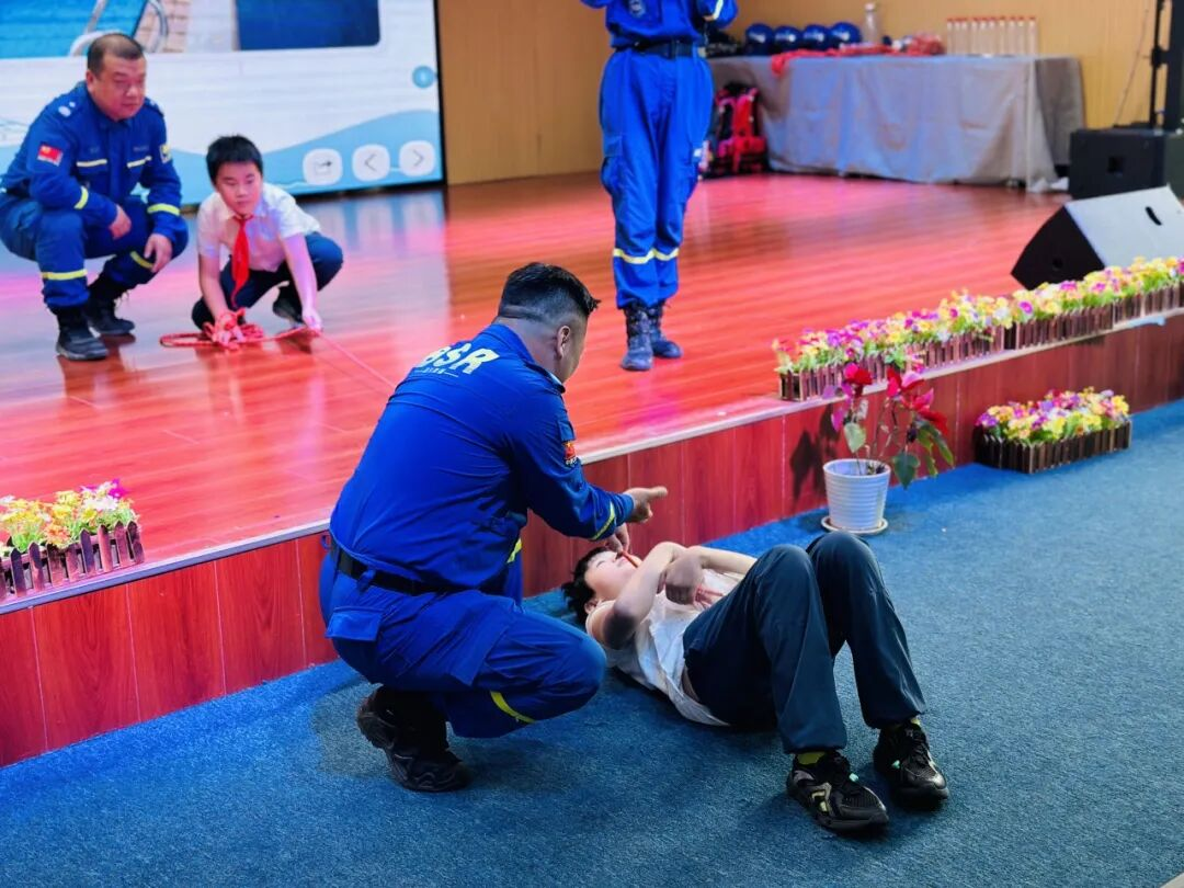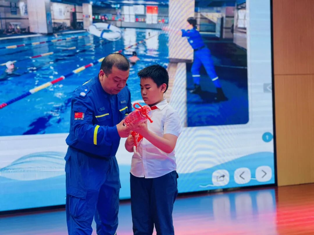 在讲解过程中,救援队队员还邀请同学们上台,进行模拟演示,手把手教大家正确使用救生衣、救生圈等救生设备,以及如何进行心肺复苏等急救操作。同学们积极参与,认真学习,现场气氛热烈。最火爆的是抛绳救援,家长代表和学生代表学习自制救援绳,并学会了怎么抛掷救援绳!