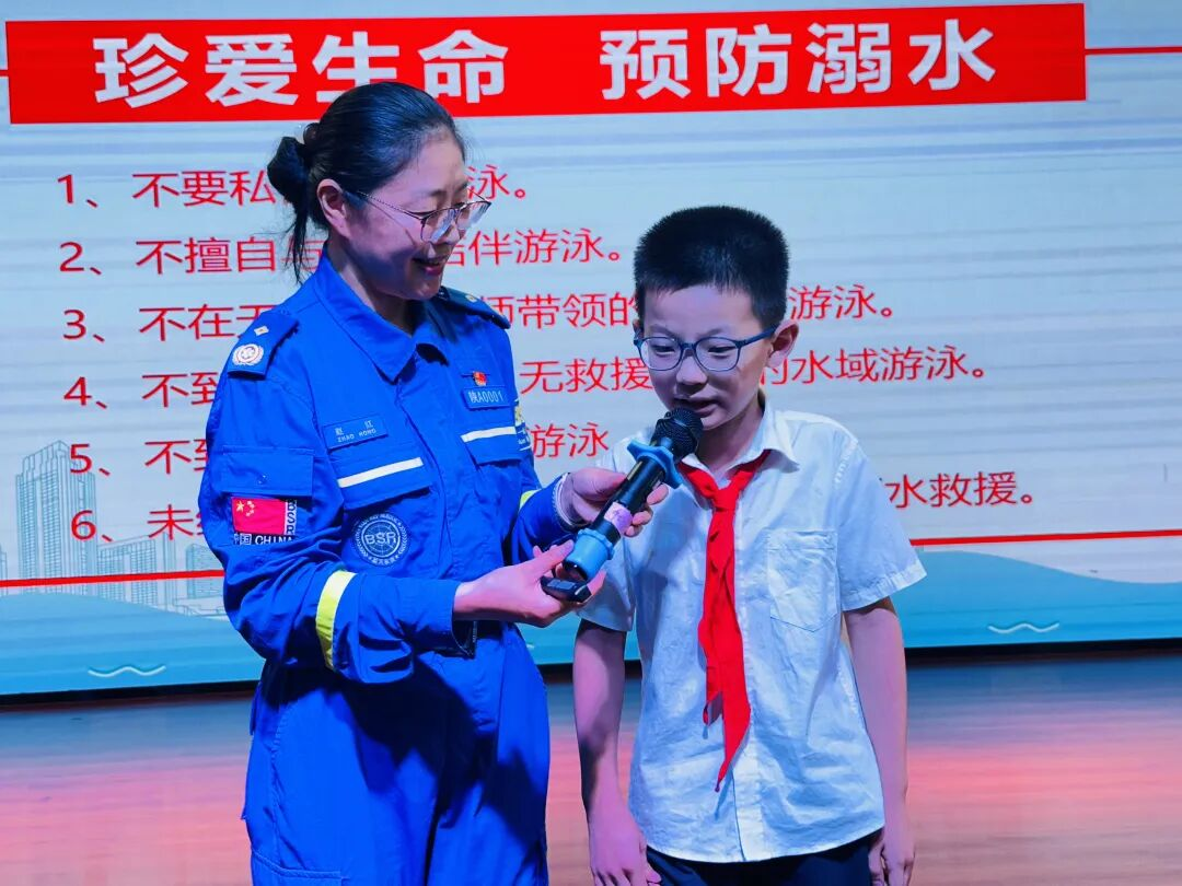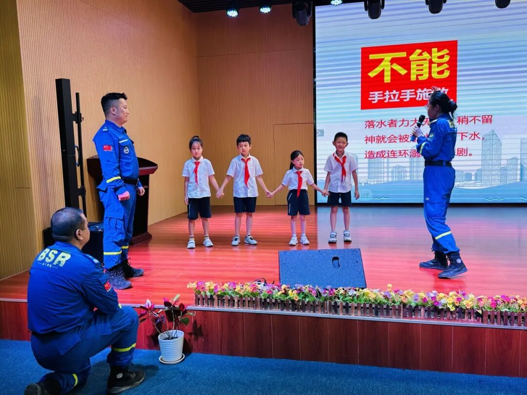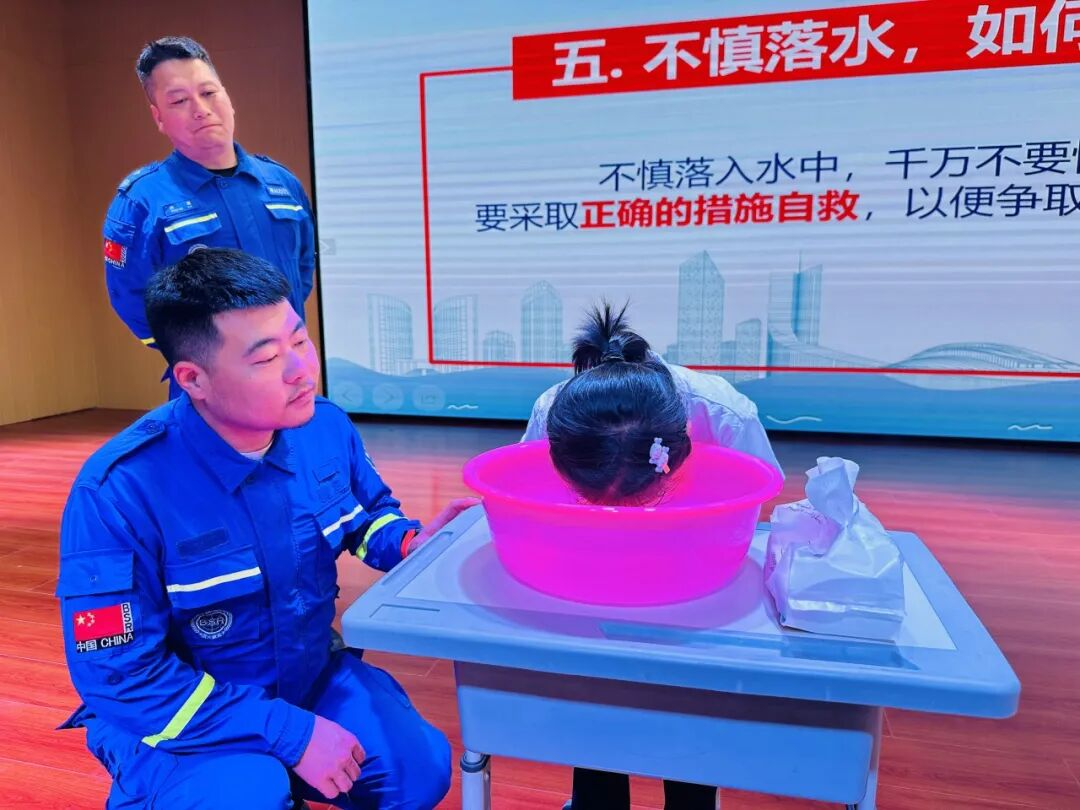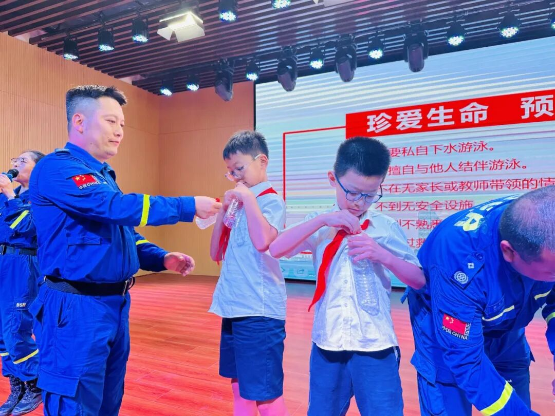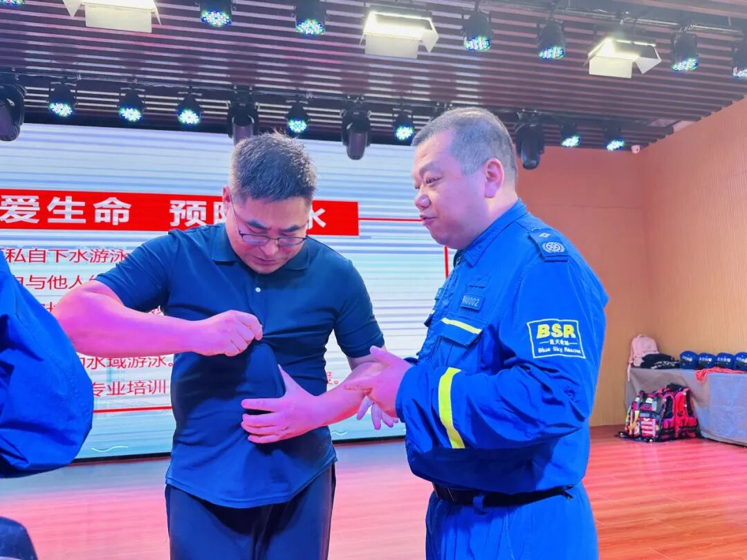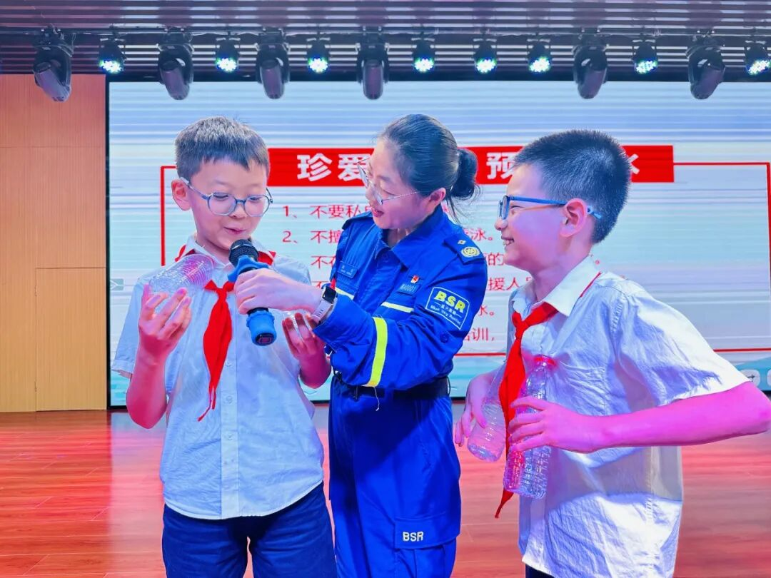 在讲解过程中,救援队队员还邀请同学们上台,进行模拟演示,手把手教大家正确使用救生衣、救生圈等救生设备,以及如何进行心肺复苏等急救操作。同学们积极参与,认真学习,现场气氛热烈。最火爆的是抛绳救援,家长代表和学生代表学习自制救援绳,并学会了怎么抛掷救援绳!