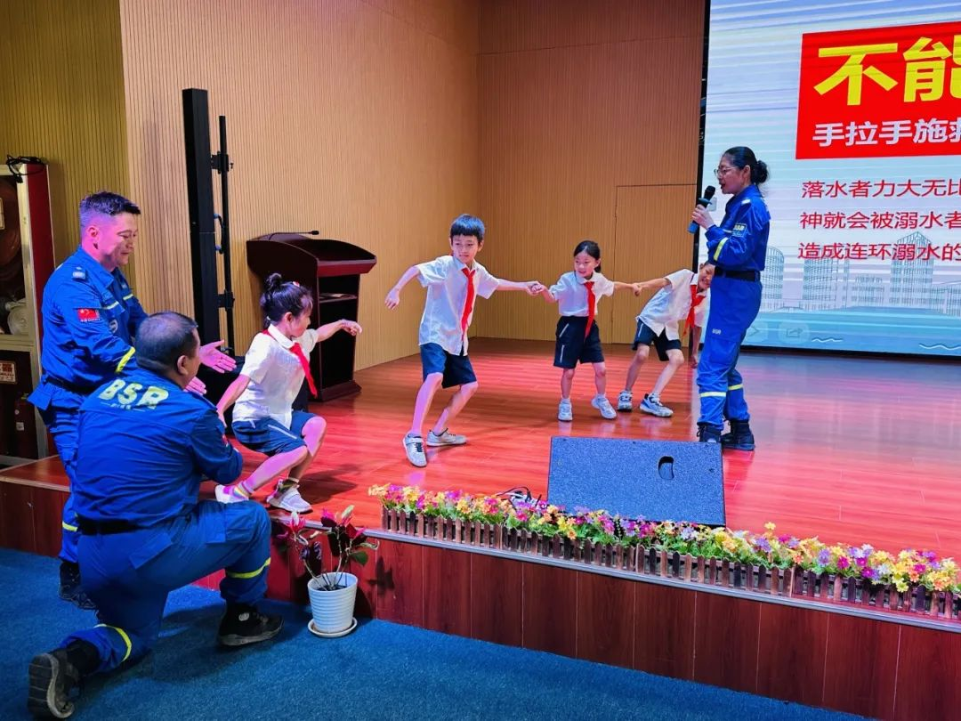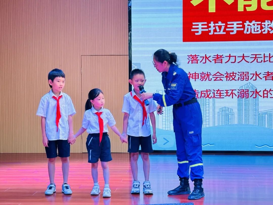 同学们还学习了在确保自身安全的前提下,如何利用竹竿、绳索等工具实施岸上救援。同时明确,一旦遇到危险情况,应第一时间呼叫大人,让大人实施岸上救援。