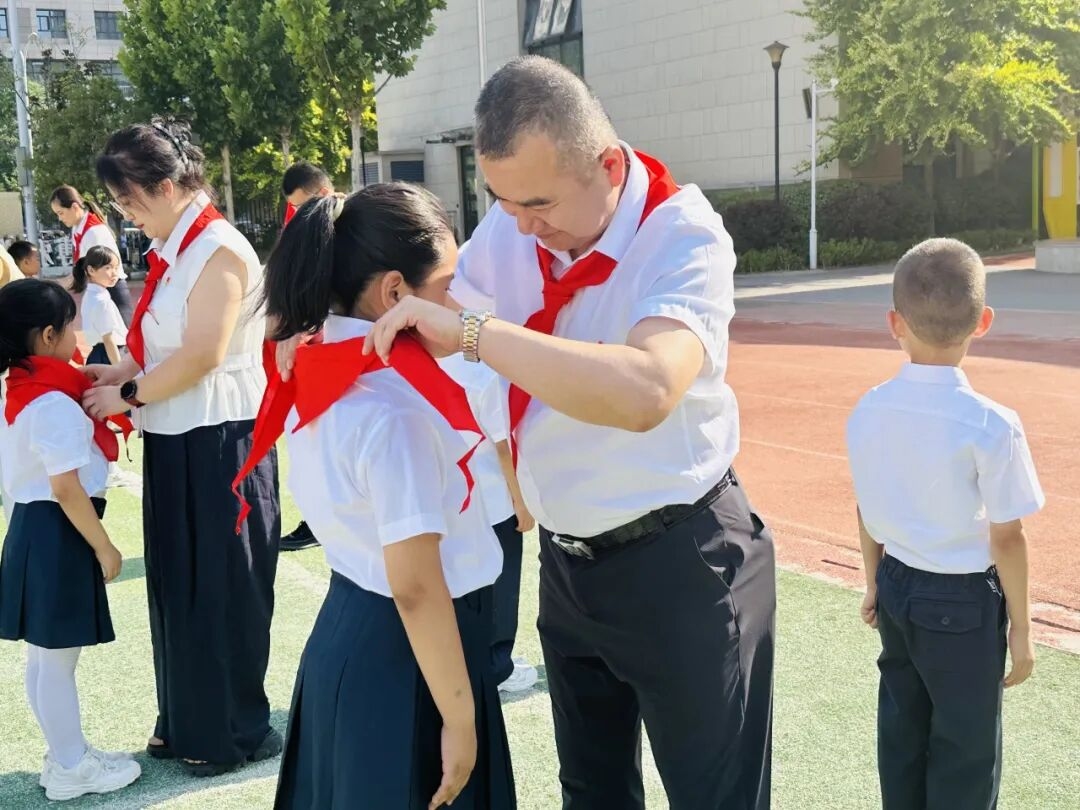 红色信仰,薪火相传。校领导、家长代表、中队辅导员及二年级少先队员代表手捧红领巾,为新队员佩戴,这是一份特殊的礼物,戴上红旗的一角,成为星星火炬的一员!