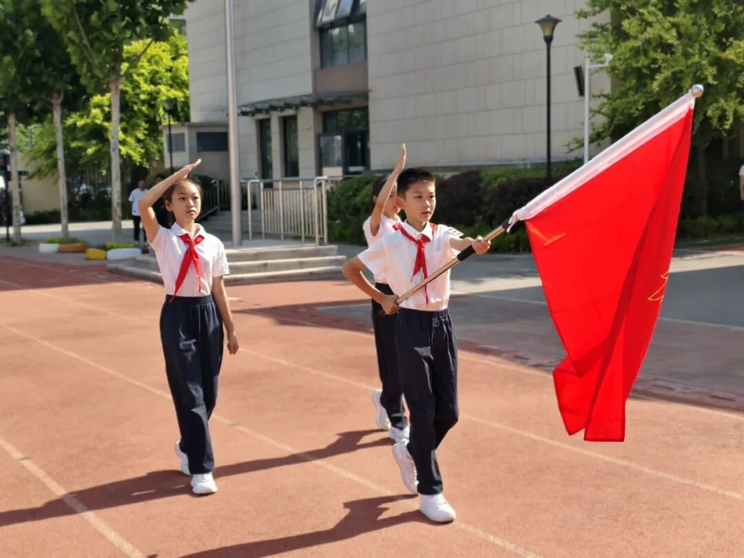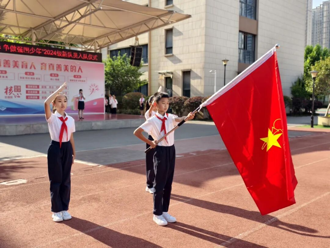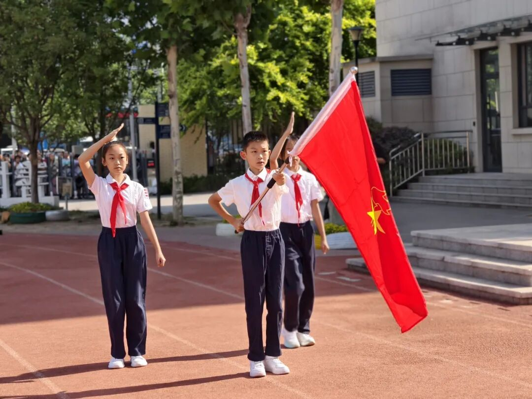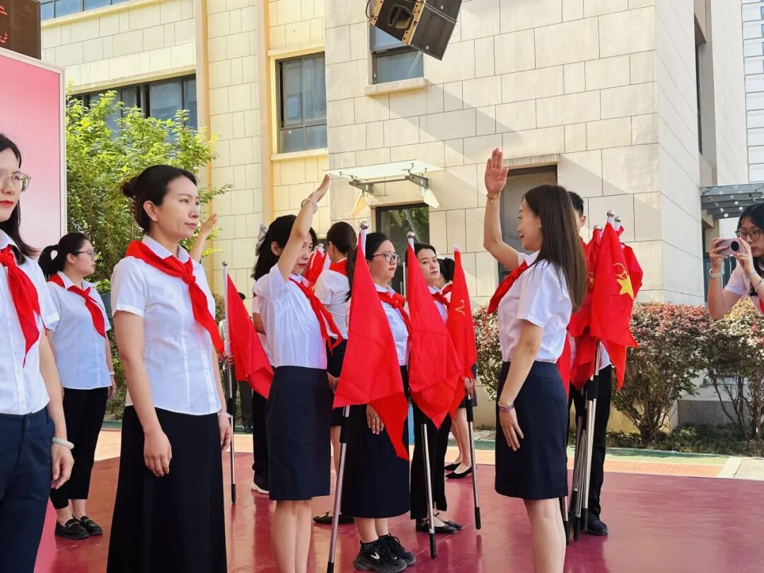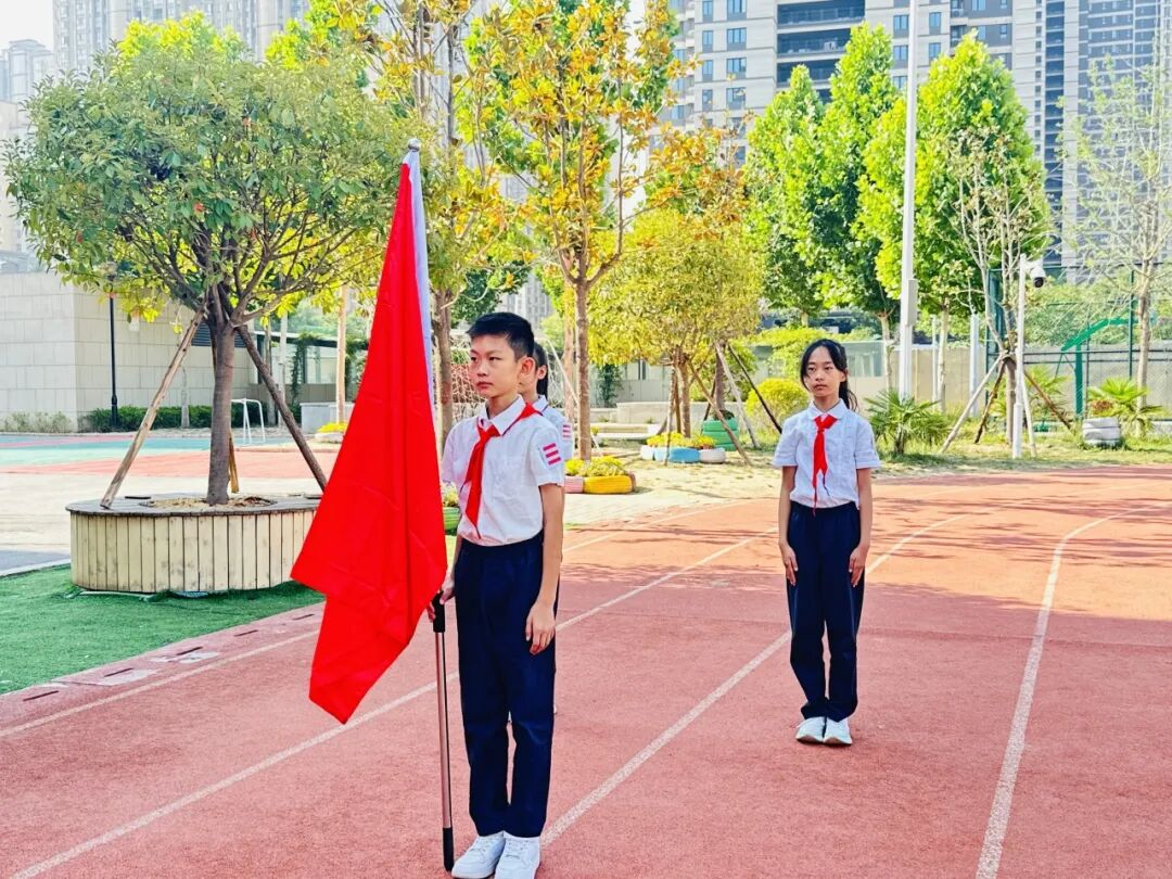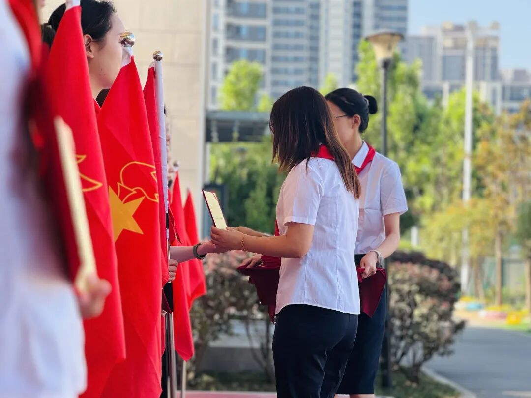 红色传递,继承精神。德育处赵主任和张主任为新建中队授中队旗,鲜艳的队旗迎风飘扬。这是一份荣誉的交接,也是一段使命的传承。