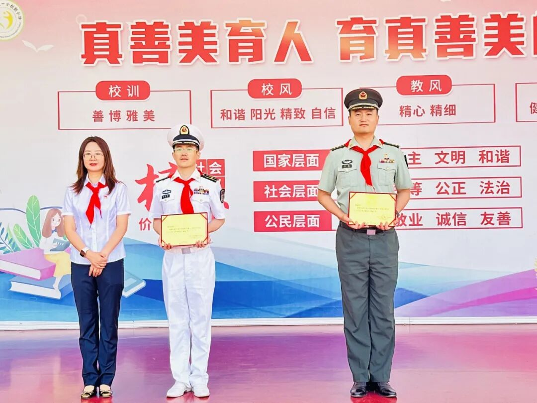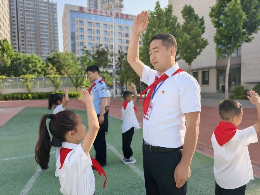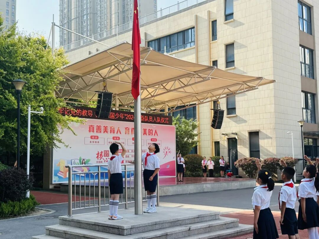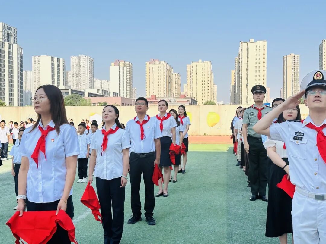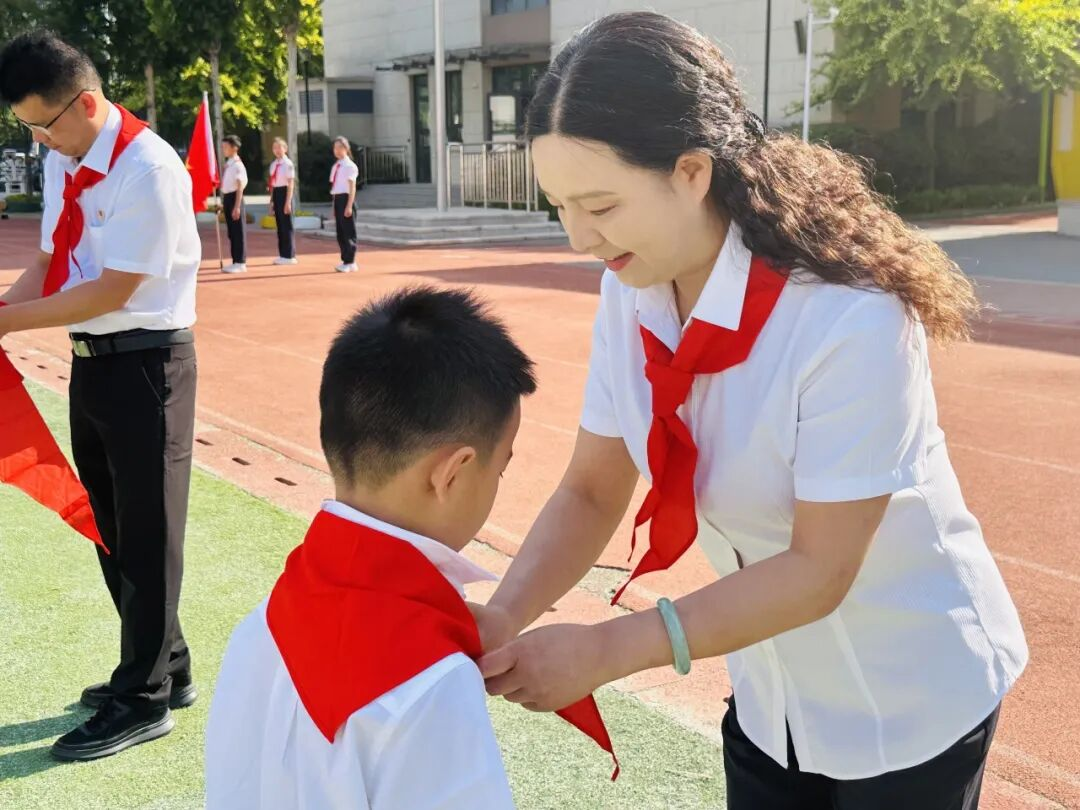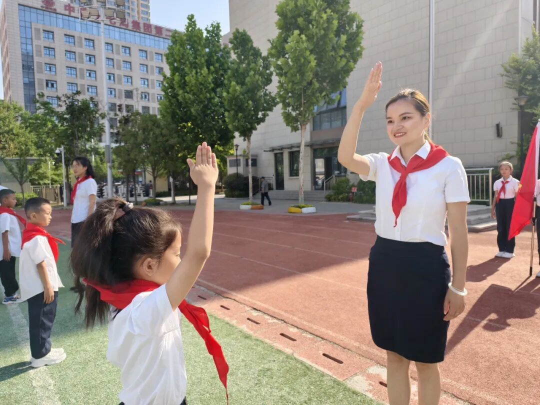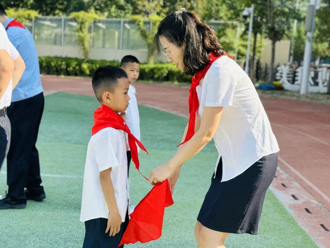 红色传递,继承精神。德育处赵主任和张主任为新建中队授中队旗,鲜艳的队旗迎风飘扬。这是一份荣誉的交接,也是一段使命的传承。