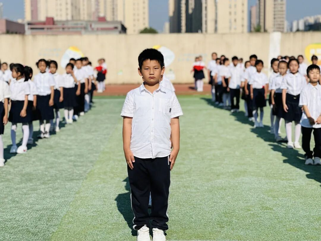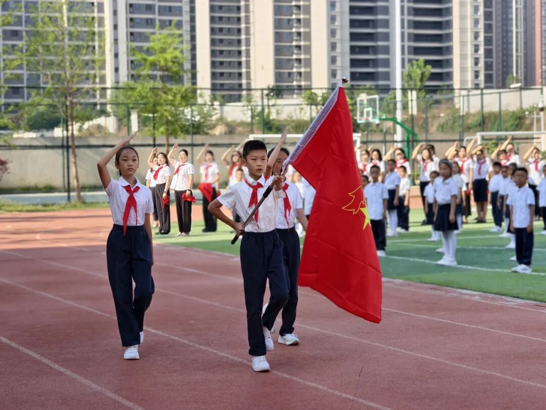 逐梦红领巾,少年当自强。庄严的国歌声中,五星红旗冉冉升起,预备队员向国旗行注目礼,目光饱含热爱与敬意。在激昂的《出旗曲》中,少先队旗手高擎队旗庄严入场。