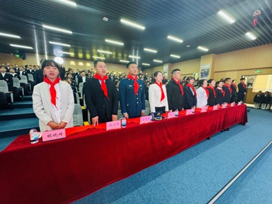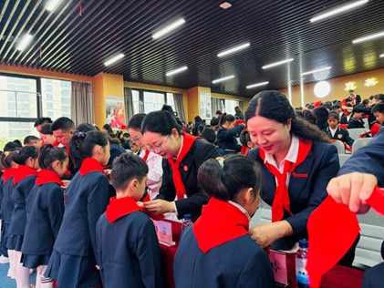 在校外嘉宾及师生代表的见证下,老师们、辅导员们、队员们手捧鲜艳的红领巾,为798名新队员们郑重佩戴。