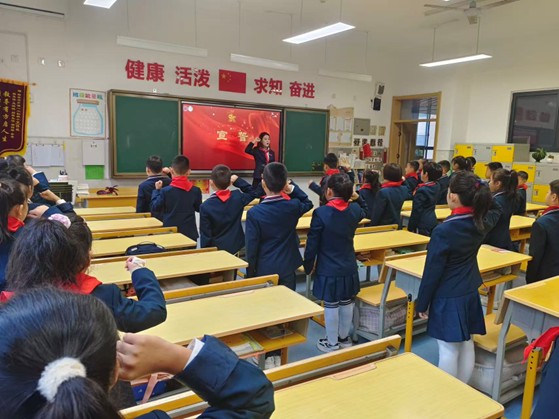 宣誓及呼号环节,队员们挺直腰板,坚定地高举右拳,跟随着大队委韩美西及仝老师响亮有力的声音,队员们的誓言在校园回荡,每一个字都深植在少先队员们的心田。