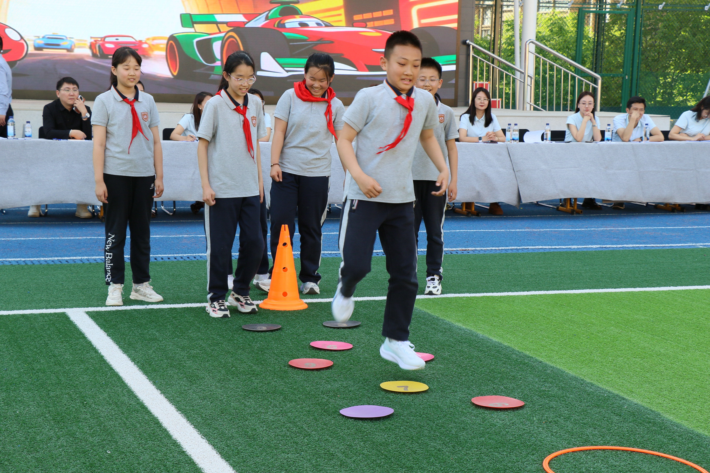 随后,调研组观摩了张宇翱老师的展示课。这节课以赛车情境贯穿始终——学生们化身“小赛车手”,在“直线加速”“弯道超车”“紧急制动”等游戏中,不知不觉完成了速度与灵敏性的专项训练。整堂课有层次、有梯度、趣味十足,学生在笑声中流汗,在挑战中成长。